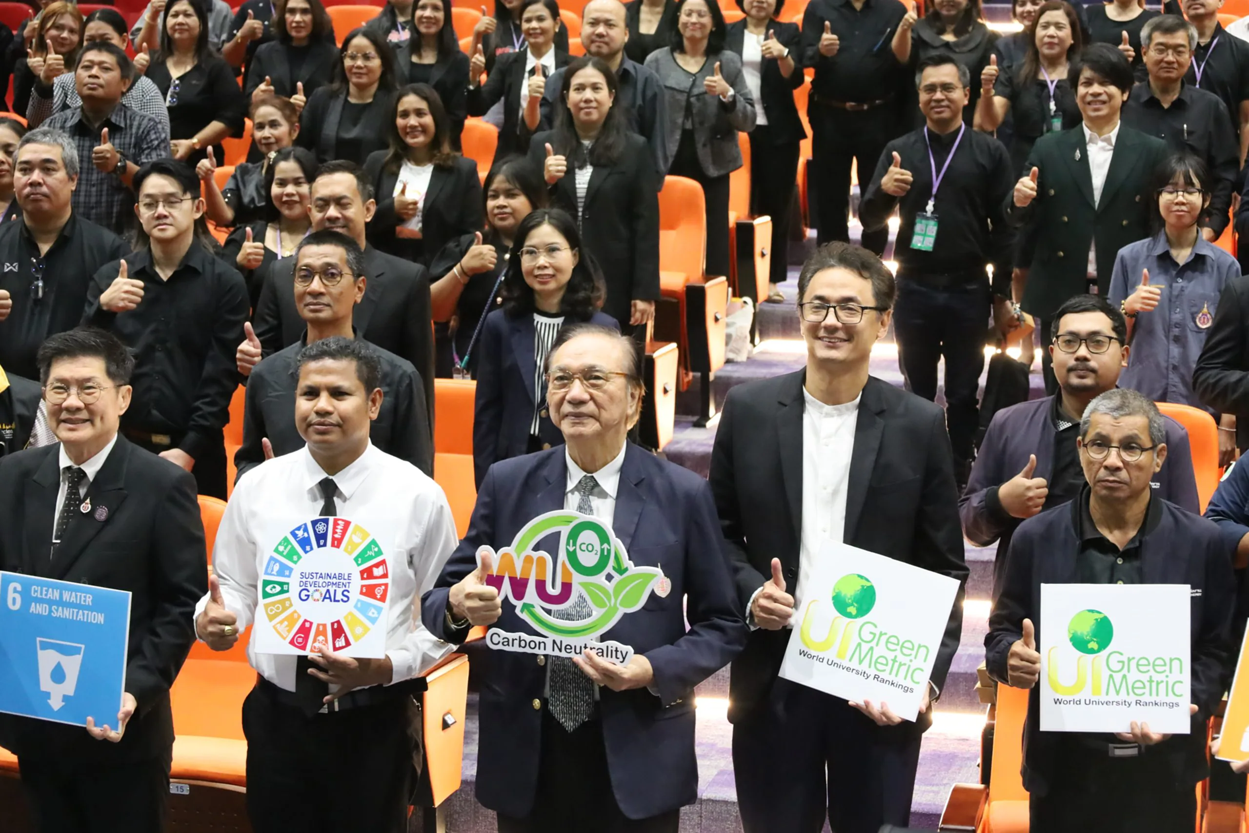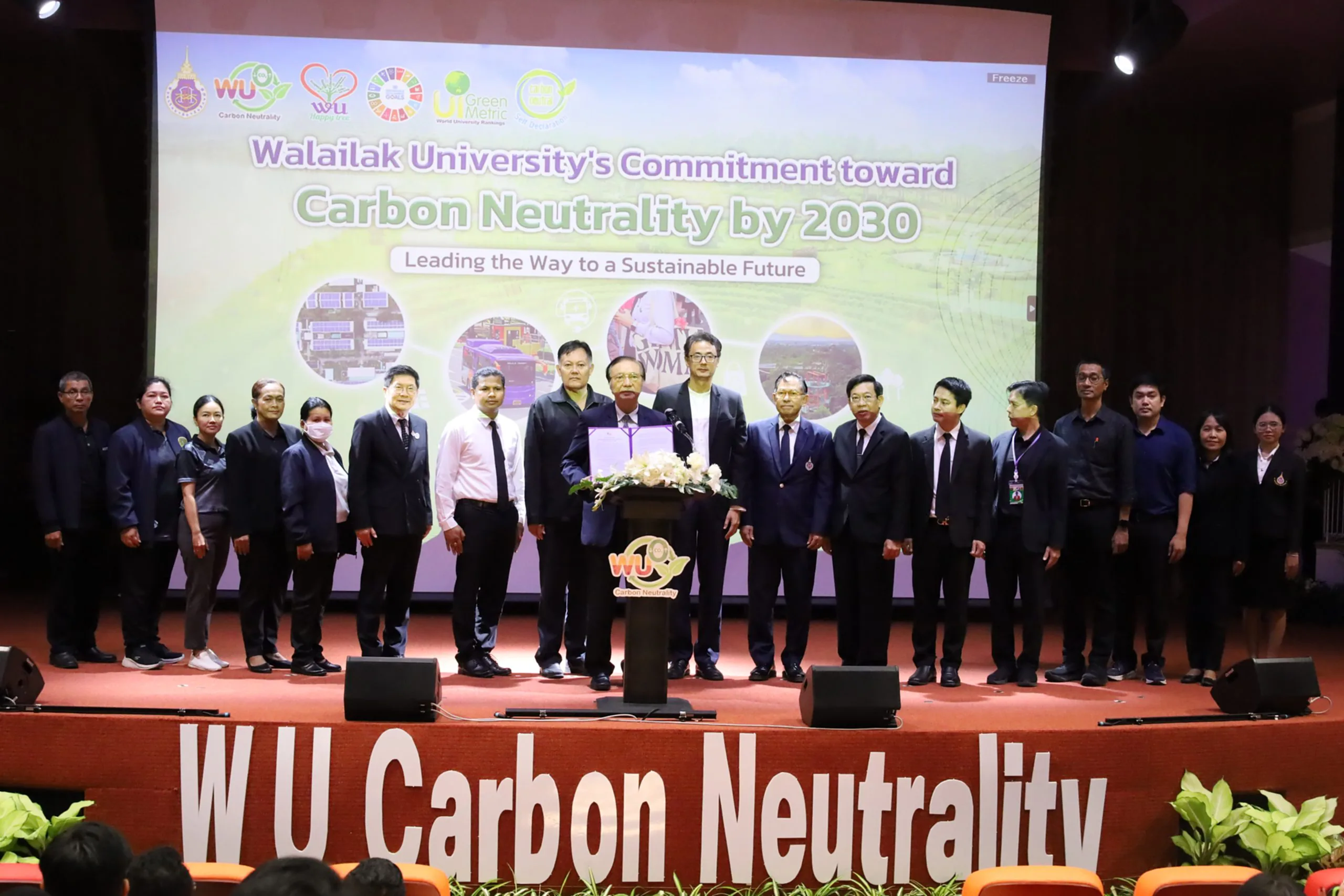 ศาสตราจารย์ ดร.สมบัติ ธำรงธัญวงศ์ อธิการบดีม.วลัยลักษณ์ กล่าวว่า วันนี้นับเป็นจุดเริ่มต้นครั้งสำคัญที่มหาวิทยาลัยวลัยลักษณ์แสดงความมุ่งมั่นอย่างเป็นทางการ ในการร่วมแก้ไขปัญหาการเปลี่ยนแปลงสภาพภูมิอากาศซึ่งเป็นวิกฤตการณ์ระดับโลก โดยมหาวิทยาลัยได้ตั้งเป้าหมายที่ท้าทายในการนำองค์กรก้าวสู่ความเป็นกลางทางคาร์บอนให้ได้ภายในปี พ.ศ. 2573 และยังเป็นการเดินหน้าตามแผนปฏิบัติการอย่างเป็นรูปธรรม สอดคล้องกับทิศทางการพัฒนาประเทศ Thailand’s National Net Zero Roadmap 2050 เป้าหมายการพัฒนาที่ยั่งยืนของสหประชาชาติและนโยบายด้านสิ่งแวดล้อมของกระทรวง อว. ซึ่งมหาวิทยาลัยวลัยลักษณ์พร้อมแล้วที่จะขับเคลื่อนสังคมคาร์บอนต่ำ และเป็นแบบอย่างของมหาวิทยาลัยสีเขียวชั้นนำของประเทศ “ที่ผ่านมา มหาวิทยาลัยวลัยลักษณ์ได้ดำเนินงานด้านการอนุรักษ์พลังงาน สิ่งแวดล้อม และการพัฒนาอย่างยั่งยืนอย่างต่อเนื่อง ไม่ว่าจะเป็นการเพิ่มประสิทธิภาพพลังงาน การใช้พลังงานหมุนเวียน การจัดการขยะอย่างเป็นระบบ การดูแลพื้นที่สีเขียวกว่า 1,500 ไร่ ตลอดจนการวิจัยและนวัตกรรมที่ช่วยสนับสนุนการจัดการก๊าซเรือนกระจก เพื่อลดภาวะโลกร้อนมาอย่างต่อเนื่อง” ศาสตราจารย์ ดร.สมบัติ กล่าว