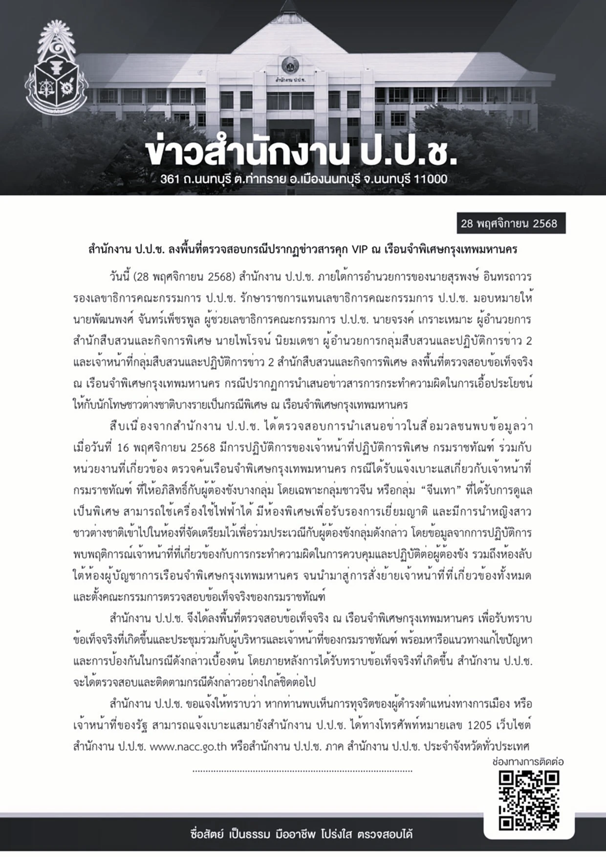 เมื่อวันที่ 28 พฤศจิกายน 2568 เวลา 14.30 น. นายพัฒนพงศ์ จันทร์เพ็ชรพูล ผู้ช่วยเลขาธิการคณะกรรมการป.ป.ช. พร้อมด้วยเจ้าหน้าที่ป.ป.ช. เข้าตรวจสอบเรือนจำพิเศษกรุงเทพมหานคร กรณีผู้ต้องขังจีนเทา VIP ได้สิทธิ์พิเศษ โดยนอกจากการตรวจสอบแล้วยังประชุมหารือในการทำสำนวน