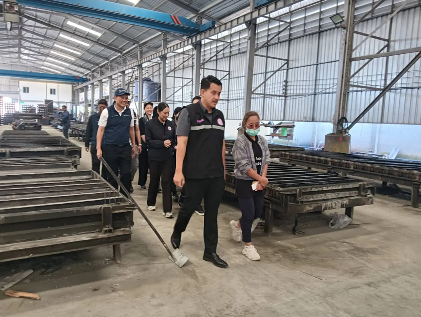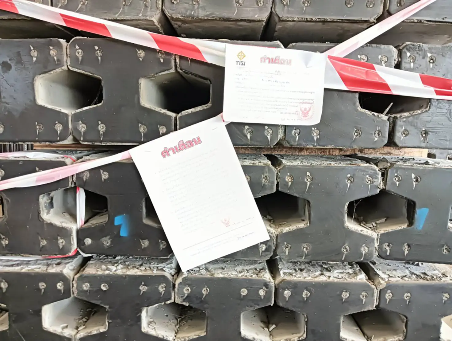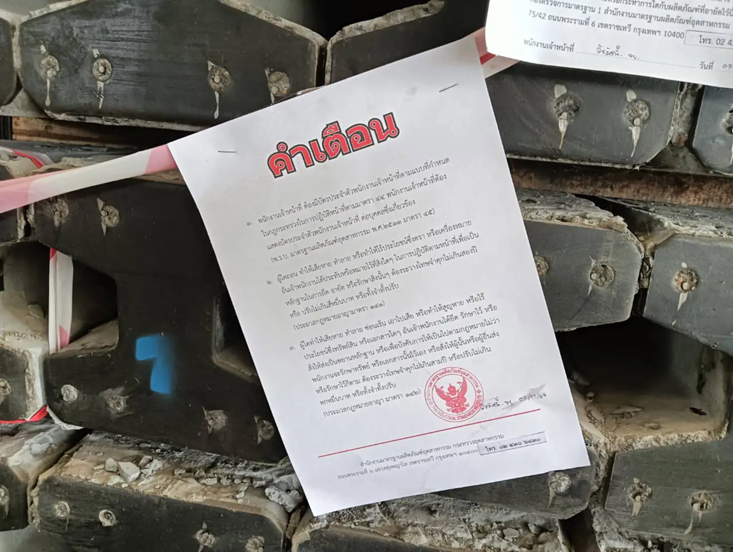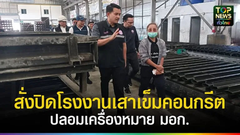 วันที่ (27 พฤศจิกายน 2568 ) นายฐาปกรณ์ กุลเจริญ-ปาล์ม เลขานุการรัฐมนตรีว่าการกระทรวงอุตสาหกรรม นายเอกนิติ รมยานนท์ เลขาธิการสำนักงานมาตรฐานผลิตภัณฑ์อุตสาหกรรม(สมอ.) นายดงพล รุจิธรรม ปลัดจังหวัดปทุมธานี และเจ้าหน้าที่ ที่เกี่ยวข้องได้ร่วมกันตรวจสอบโรงงานฐานทองคอนกรีต เลขที่ 18/18 ม.13 ซอยคลองห้าตะวันออก ต.คลองห้า อ.คลองหลวง จ.ปทุมธานี ซึงเป็นผู้ผลิตและจำหน่ายเสาเข็มไม่ได้มาตรฐาน หลังได้รับการร้องเรียนว่ามีการผลิตเสาเข็มคอนกรีตเสริมเหล็กขนาดสั้นไม่ได้มาตรฐานและแสดงเครื่องหมาย มอก.โดยไม่ได้รับอนุญาตจากการตรวจสอบเบื้องต้นพบว่าโรงงานดังกล่าวมีการผลิตเสาเข็มคอนกรีตเสริมเหล็กอัดแรงหล่อสำเร็จความยาว 1.5 เมตรและเสาเข็มคอนกรีตเสริมเหล็กขนาดสั้นความยาว 1.5 เมตรโดยมีการแสดงเครื่องหมาย มอก.ซึ่งเป็นการปลอมเครื่องหมายมอกรวมจำนวน 2469 ท่อนมูลค่า 1,599,000 บาทและยังตรวจสอบพบว่าแผ่นเพลท สำหรับพ่นเครื่องหมาย มอก.ในสายการผลิตซึ่งการกระทำดังกล่าวเข้าข่ายการจงใจหลอกลวงประชาชนให้เข้าใจผิดว่าเป็นสินค้าได้มาตรฐานจากการตรวจสอบในเบื้องต้นพบว่าโรงงานแห่งนี้ยังไม่ได้รับใบอนุญาตประกอบกิจการโรงงานวงเล็บปิดรง 4 จากกรมโรงงานอุตสาหกรรมจึงสั่งให้สมอและสำนักงานอุตสาหกรรมจังหวัดปทุมธานีดำเนินการตามกฎหมายอย่างสูงที่สุดต่อไป
