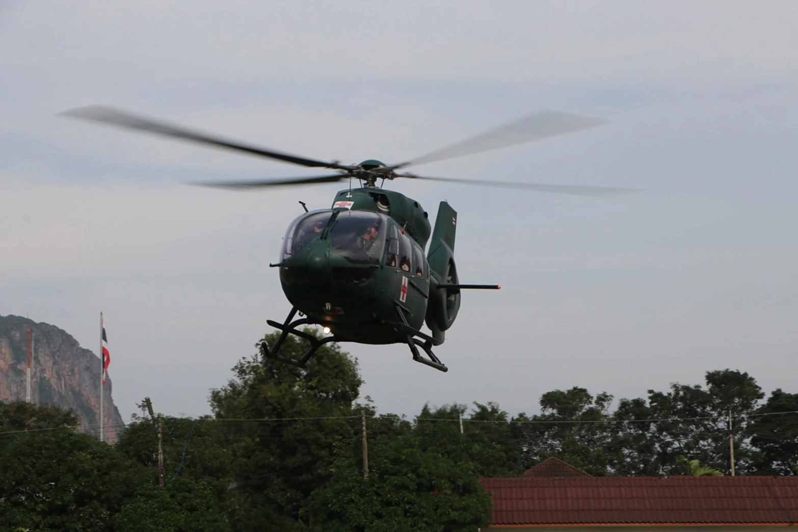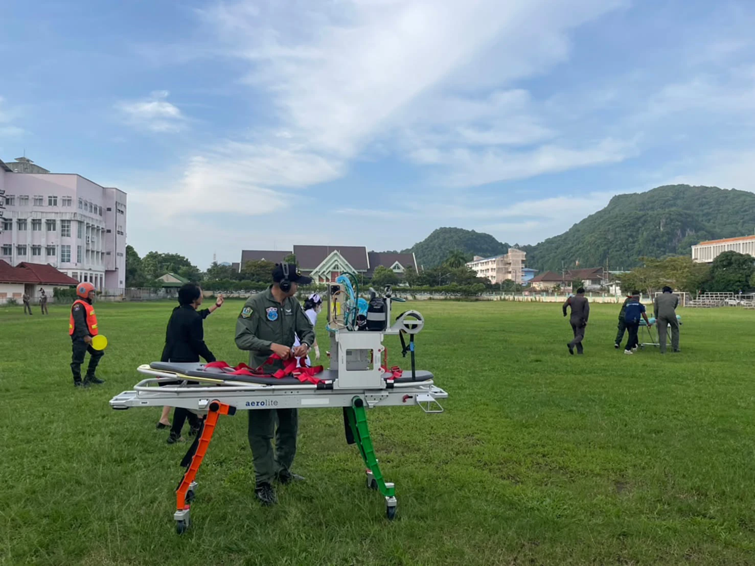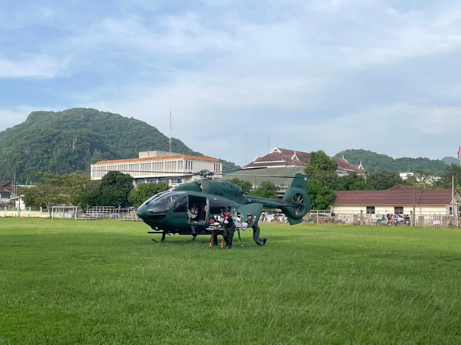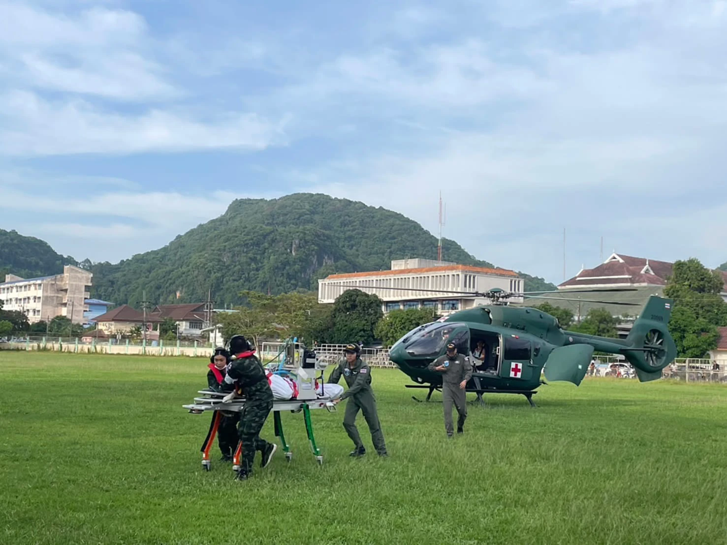การลำเลียงผู้ป่วยดำเนินการด้วยเฮลิคอปเตอร์จำนวน 3 เที่ยวบิน พร้อมทีมแพทย์ ทหารพยาบาล และอุปกรณ์ช่วยชีวิตขั้นสูง เพื่อดูแลอาการผู้ป่วยตลอดการเดินทางให้เป็นไปอย่างปลอดภัย เฮลิคอปเตอร์ได้ลงจอด ณ ลานชั่วคราวสนามฟุตบอลโรงเรียนพัทลุง ซึ่งมีทีมแพทย์ พยาบาล รถพยาบาลฉุกเฉิน และทีมกู้ชีพเฝ้ารอรับผู้ป่วยอย่างพร้อมเพรียง ก่อนเร่งนำตัวทั้ง 5 รายเข้าสู่ห้องฉุกเฉินของโรงพยาบาลพัทลุงทันที
