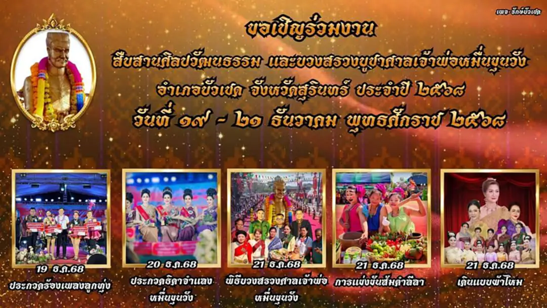 ชาวอำเภอบัวเชด ขอเชิญร่วมงาน รำบวงสรวงเจ้าพ่อหมื่นขุนวัง ประจำปี 2568 ระหว่างวันที่ 19-21 ธันวาคม2568 นี้