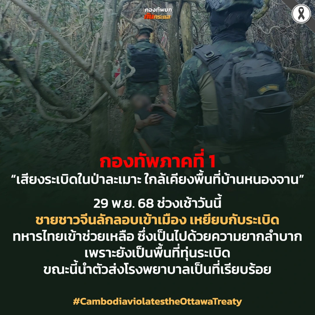 กองทัพภาคที่ 1 โดยศูนย์ปฏิบัติการกองทัพภาคที่ 1 ได้รับรายงานจาก กองกำลังบูรพา มีผู้ลักลอบข้ามมาฝั่งไทยและเหยียบกับระเบิดจนได้รับบาดเจ็บ จากการตรวจสอบ พบว่า เมื่อ 29 พ.ย.68 เวลา 05.50 น. เจ้าหน้าที่ ตชด.สังกัดร้อย.ฉก.ตชด.4 ได้ยินเสียงระเบิดดังบริเวณป่าละเมาะห่างจาก ถ.ศรีเพ็ญ ประมาณ 80-90 เมตร หน่วยเฉพาะกิจที่ 12 จึงได้นำโดรนขึ้นตรวจสอบประเมินสถานการณ์