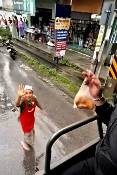 รับมาแล้ว มือสั้นทำขนมหล่นลงพื้นเพราะในใจตื่นเต้นที่ประชาชนแสดงความรักมาให้ขนาดนั้น แต่ไม่ยอมทิ้งหยิบขึ้นมากินเพราะมันคือน้ำใจงามๆ ของชาวบ้าน