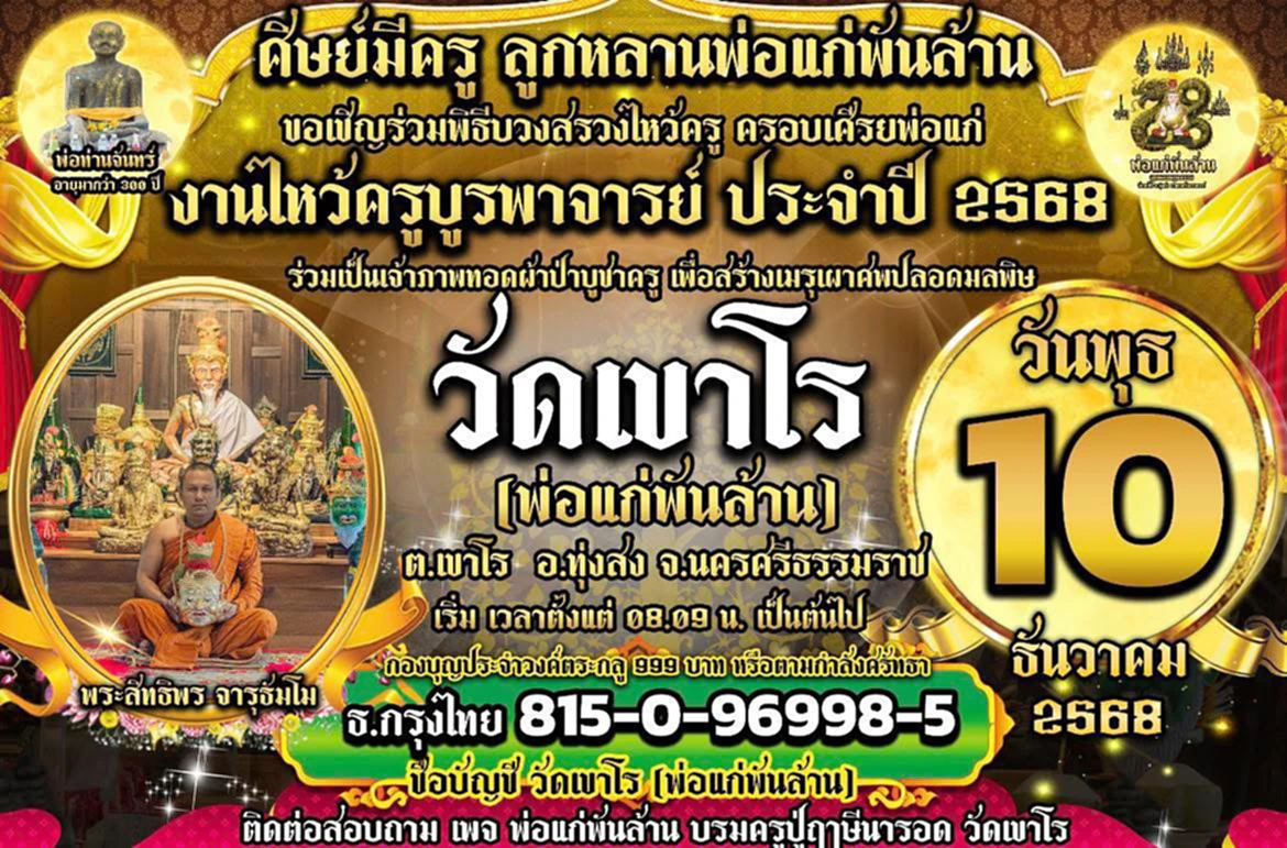 วันที่ 29 พ.ย. 2568 ผู้สื่อข่าวรายงานว่า ที่วัดเขาโร มีการเตรียมจัดงานพิธีไหว้ครูบูรพาจารย์ ประจำปี พ.ศ. 2568 ซึ่งจัดขึ้นต่อเนื่องเป็นปีที่ 6 ภายใต้แนวคิด “ศิษย์มีครู ครูดี บารมีแรงครู” เพื่อสืบสานประเพณีการเคารพบูชาครู พร้อมแสดงความกตัญญูกตเวทีต่อบูรพาจารย์ โดยงานจะจัดขึ้นระหว่างวันที่ 9 ธ.ค. – 10 ธ.ค. 2568