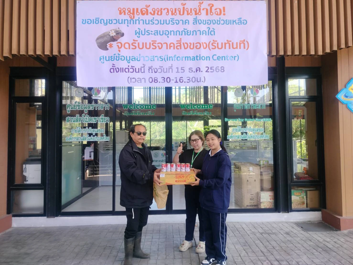 (29 พ.ย. 68) นายศรีศักดิ์ สุขชุ่ม ผู้ช่วยผู้อำนวยการสวนสัตว์ รักษาการแทนผู้อำนวยการสวนสัตว์เปิดเขาเขียว นำทีมรับมอบสิ่งของบริจาคชุดแรกอย่างเป็นทางการ ณ ศูนย์ข้อมูลข่าวสาร ลานจอดรถ 1 ท่ามกลางการรวมพลังของพนักงาน ลูกจ้าง และประชาชน ที่เร่งส่งมอบข้าวของเครื่องใช้ที่จำเป็น เพื่อส่งต่อความช่วยเหลือเร่งด่วนไปยังพี่น้องผู้ประสบอุทกภัยในพื้นที่ภาคใต้