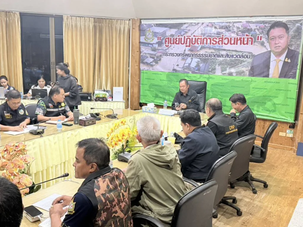 จากข้อสั่งการของนายสุชาติ ชมกลิ่น รองนายกรัฐมนตรี และรัฐมนตรีว่าการกระทรวงทรัพยากรธรรมชาติและสิ่งแวดล้อม ที่ให้เร่งระดมสรรพกำลัง วัสดุอุปกรณ์ ยานพาหนะและเครื่องมือเข้าช่วยเหลือและบรรเทาทุกข์แก่พี่น้องประชาชนที่ประสบอุทกภัยในพื้นที่ภาคใต้ โดยมอบหมายให้ พล.ต.ต.นันทชาติ ศุภมงคล ที่ปรึกษารัฐมนตรีว่าการกระทรวงทรัพยากรธรรมชาติและสิ่งแวดล้อม นั่งหัวโต๊ะบัญชาการศูนย์ปฏิบัติการกระทรวงทรัพยากรธรรมชาติและสิ่งแวดล้อมในพื้นที่จังหวัดสงขลา