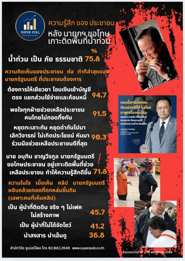30 พ.ย.2568 สำนักวิจัยซูเปอร์โพล เปิดเผยผลสำรวจความคิดเห็นประชาชนทุกสาขาอาชีพทั่วประเทศ จากกลุ่มตัวอย่างจำนวนทั้งสิ้น 1,142 ตัวอย่าง ระหว่างวันที่ 29–30 พฤศจิกายน 2568 เพื่อศึกษาความรู้สึก ความต้องการ และมุมมองของประชาชนต่อเหตุการณ์มหาอุทกภัยภาคใต้ รวมถึงท่าทีของนายกรัฐมนตรี นายอนุทิน ชาญวีรกูล ที่ได้ออกมาขอโทษประชาชน ยอมรับความบกพร่อง และลงพื้นที่ให้ความช่วยเหลือด้วยตัวเองอย่างต่อเนื่อง ผลสำรวจนี้สะท้อนภาพรวมของ “ความรู้สึกใหม่” หลังเหตุการณ์น้ำท่วมใหญ่ ซึ่งเป็นทั้งวิกฤติของภัยธรรมชาติ และบททดสอบสำคัญของรัฐบาลชุดปัจจุบัน