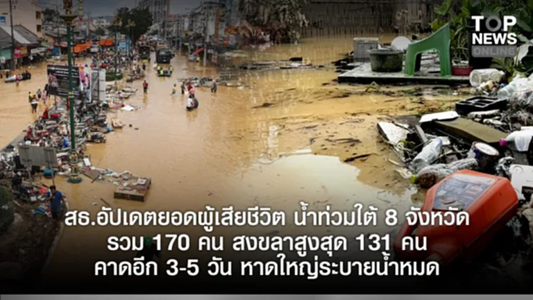 สธ.อัปเดตยอดผู้เสียชีวิต น้ำท่วมใต้ 8 จังหวัด รวม 170 คน สงขลาสูงสุด 131 คน คาดพื้นที่หาดใหญ่ระบายน้ำหมด 3-5 วัน ประปามาครบ – Top News รายงาน