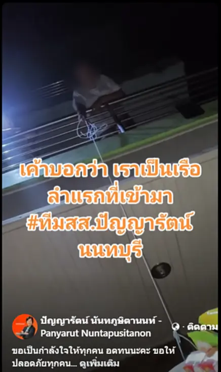 โดยในคลิปดังกล่าว จะเห็นว่ามีผู้ประสบภัยน้ำท่วมรอการช่วยเหลืออยู่บน 2 ชั้นของบ้าน พร้อมกล่าวว่า “พี่รู้เปล่า พี่เป็นเรือลำแรกที่เข้ามาจอดตรงนี้” จากนั้นทีมงานที่เข้ามาช่วยเหลือก็บอกชาวบ้านว่า ให้ใหม่อีกรอบได้ไหม พร้อมบอกด้วยว่า “ฝาก อู๊ด ชลธี สุนทรสุจริต” จากพรรคประชาชน ทีมงาน นางปัญญารัตน์ นันทภูษิตานนท์ สส.นนทบุรี เขต 2 พรรคประชาชน ด้วยนะคะ