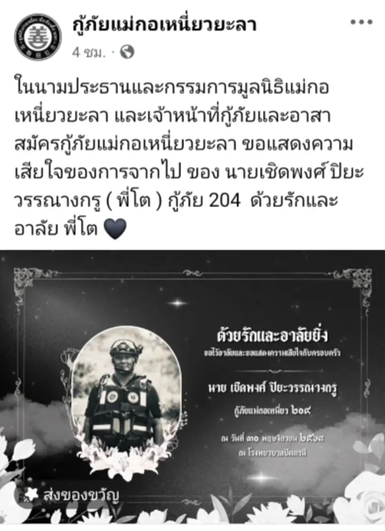 เมื่อวันที่ 30 พฤศจิกายน 2568 วงการกู้ภัยและอาสาสมัครในพื้นที่จังหวัดชายแดนใต้ต้องตกอยู่ในความโศกเศร้า หลังการจากไปอย่างสงบของ นายเชิดพงษ์ ปิยะวรรณางกรู หรือที่คนในวงการรู้จักกันดีในนาม “พี่โต กู้ภัย 204” และสมาชิกทีม ฉลามภัย 034 ซึ่งเสียชีวิตลงอย่างน่าเศร้าภายหลังเกิดภาวะหัวใจล้มเหลวเฉียบพลัน ขณะเดินทางกลับจากการปฏิบัติภารกิจช่วยเหลือผู้ประสบอุทกภัยครั้งใหญ่ในพื้นที่ อ.หาดใหญ่ จ.สงขลา เมื่อปี 2568