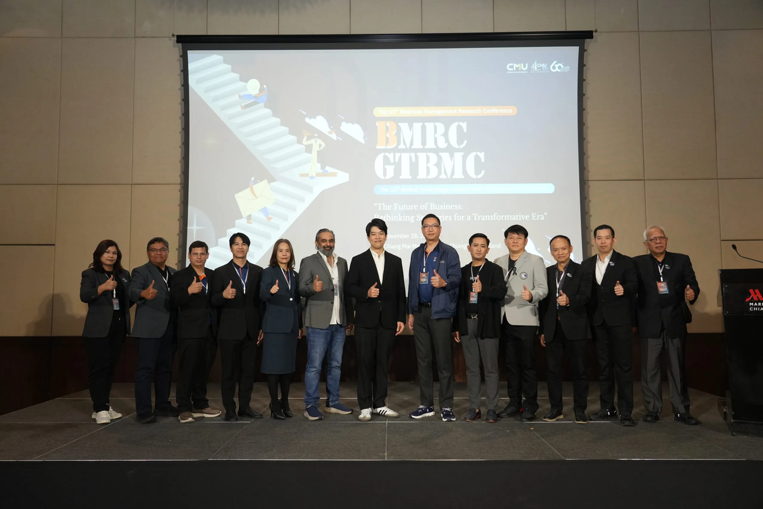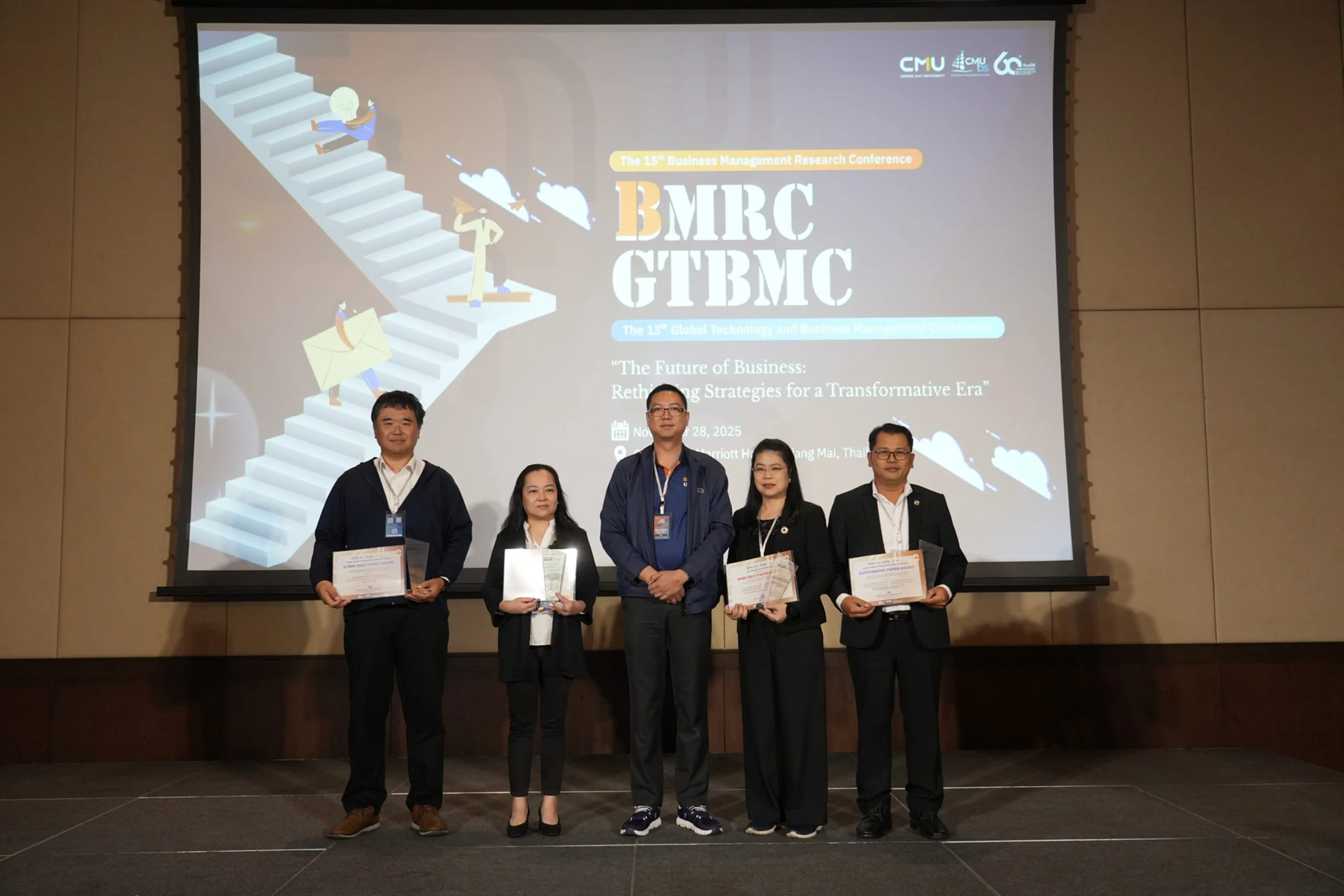เมื่อวันที่ 28 พฤศจิกายน 2568  คณะบริหารธุรกิจ มหาวิทยาลัยเชียงใหม่ ร่วมกับสมาคมสำนักงานบัญชีคุณภาพ สมาคมสำนักงานสอบบัญชีไทย และ BINUS University Business School สาธารณรัฐอินโดนีเซีย จัดการประชุมผลงานวิจัยด้านการจัดการธุรกิจระดับชาติ ครั้งที่ 15 (The Business Management Research Conference: BMRC) และการประชุมผลงานวิจัยนานาชาติด้านการจัดการธุรกิจ ครั้งที่ 13 (The Global Technology and Business Management Conference: GTBMC) ภายใต้แนวคิด “The Future of Business: Rethinking Strategies for a Transformative Era” ณ โรงแรมเชียงใหม่ แมริออท เพื่อเปิดเวทีให้อาจารย์ นักวิจัย และนักวิชาการจากทั้งในและต่างประเทศ นำเสนอผลงานวิจัย ประกวดบทความ และแลกเปลี่ยนองค์ความรู้เชิงลึกที่สร้างผลกระทบทั้งด้านวิชาการ นวัตกรรม และสังคม พร้อมเสริมศักยภาพนักวิชาการและนักศึกษาระดับบัณฑิตศึกษาให้นำองค์ความรู้ไปต่อยอดสู่การพัฒนาธุรกิจในระดับชุมชนและระดับประเทศ โดยมีผู้เข้าร่วมงานกว่า 160 คน