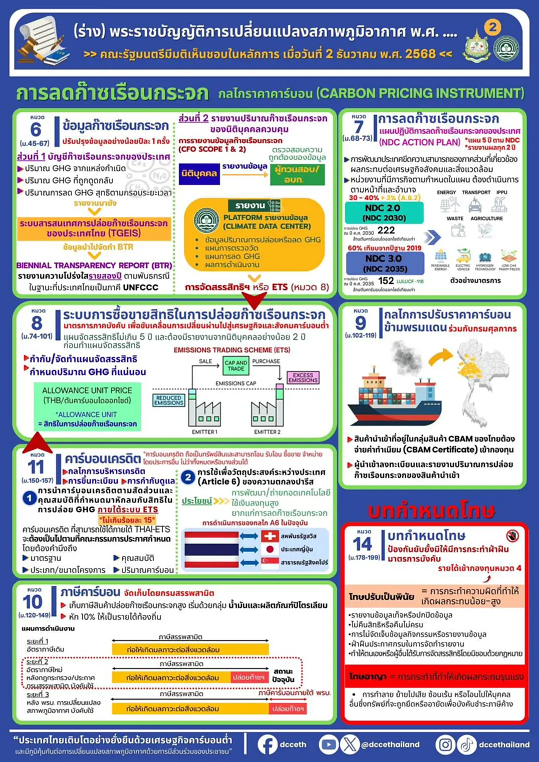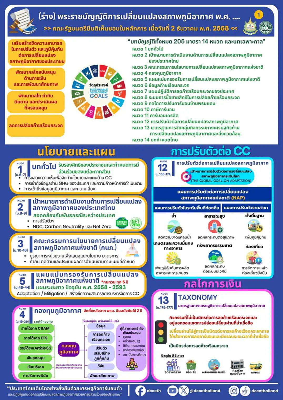 วันที่ 2 ธันวาคม 2568 นายสุชาติ ชมกลิ่น รองนายกรัฐมนตรีและรัฐมนตรีว่าการกระทรวงทรัพยากรธรรมชาติและสิ่งแวดล้อม (รมว.ทส.) เปิดเผยว่า คณะรัฐมนตรี (ครม.) มีมติเห็นชอบต่อหลักการของร่างพระราชบัญญัติการเปลี่ยนแปลงสภาพภูมิอากาศ พ.ศ. …. ซึ่งเป็นการวางรากฐานทางกฎหมายที่สำคัญฉบับแรกของไทยในการจัดการปัญหาโลกร้อนร่วมกับนานาชาติ ผ่านการสร้างกลไกบริหารจัดการผลกระทบของสภาพภูมิอากาศรุนแรงของภาครัฐร่วมกับทุกภาคส่วนอย่างเป็นทางการ รวมถึงการพัฒนาขีดความสามารถทางการค้ารูปแบบคาร์บอนต่ำของไทยให้สอดคล้องกับเป้าหมายการปล่อยก๊าซเรือนกระจกสุทธิให้เป็นศูนย์ภายในปี พ.ศ. 2093 (Net Zero 2050) ในเวทีโลก ส่งผลให้ไทยมีเครื่องมือและโอกาสในการสร้างภูมิคุ้มกันให้แก่ประเทศชาติและประชาชนเพื่อต่อสู้กับผลกระทบจากปัญหาโลกร้อนได้อย่างมีประสิทธิภาพและยั่งยืน