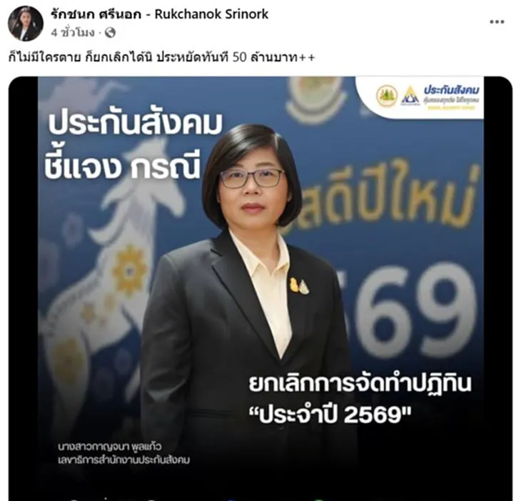 วันนี้ นางสาวกาญจนา พูลแก้ว เลขาธิการสำนักงานประกันสังคม ชี้แจงเหตุกรณียกเลิกการจัดทำปฏิทินประกันสังคม ประจำปี 2569 เป็นความจำเป็น ที่เกิดจากกระบวนการจัดซื้อจัดจ้างที่ล่าช้าจากการอุทธรณ์ผลการประกวดราคา ส่งผลให้ไม่สามารถผลิตและส่งมอบปฏิทินได้ทันกำหนดในเดือนธันวาคม 2568 หากดำเนินการต่ออาจก่อให้เกิดความเสียหายและไม่คุ้มค่าต่อการใช้งบประมาณจึงจำเป็นต้องยุติการจัดจ้าง