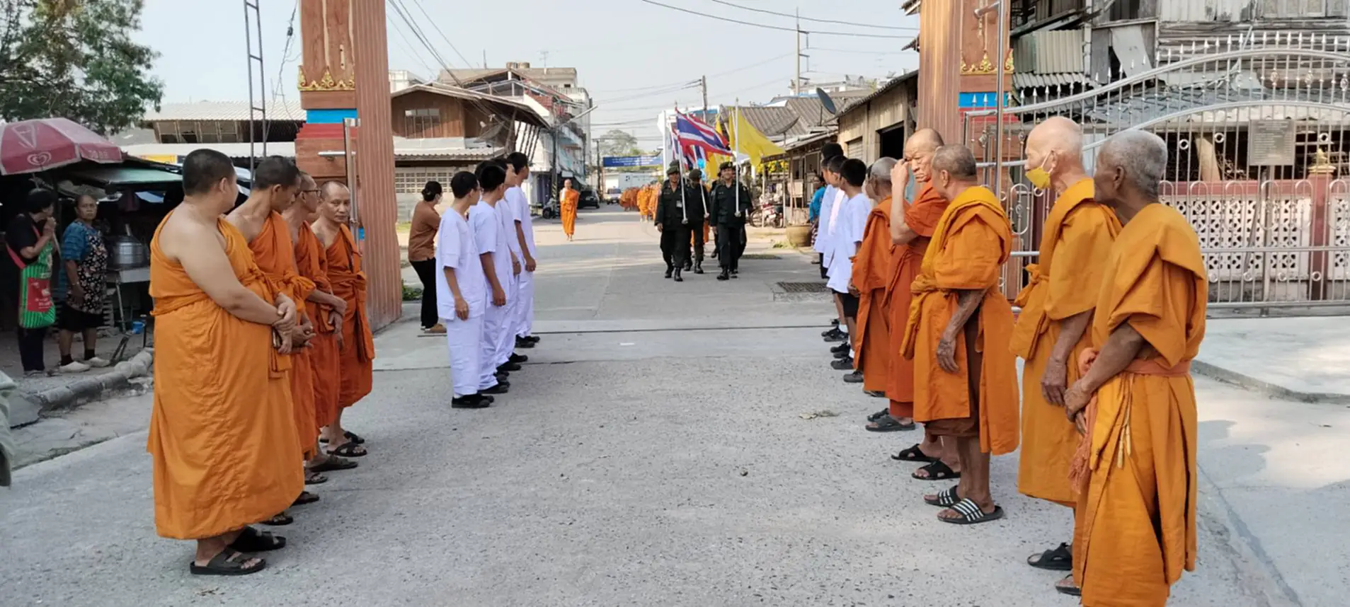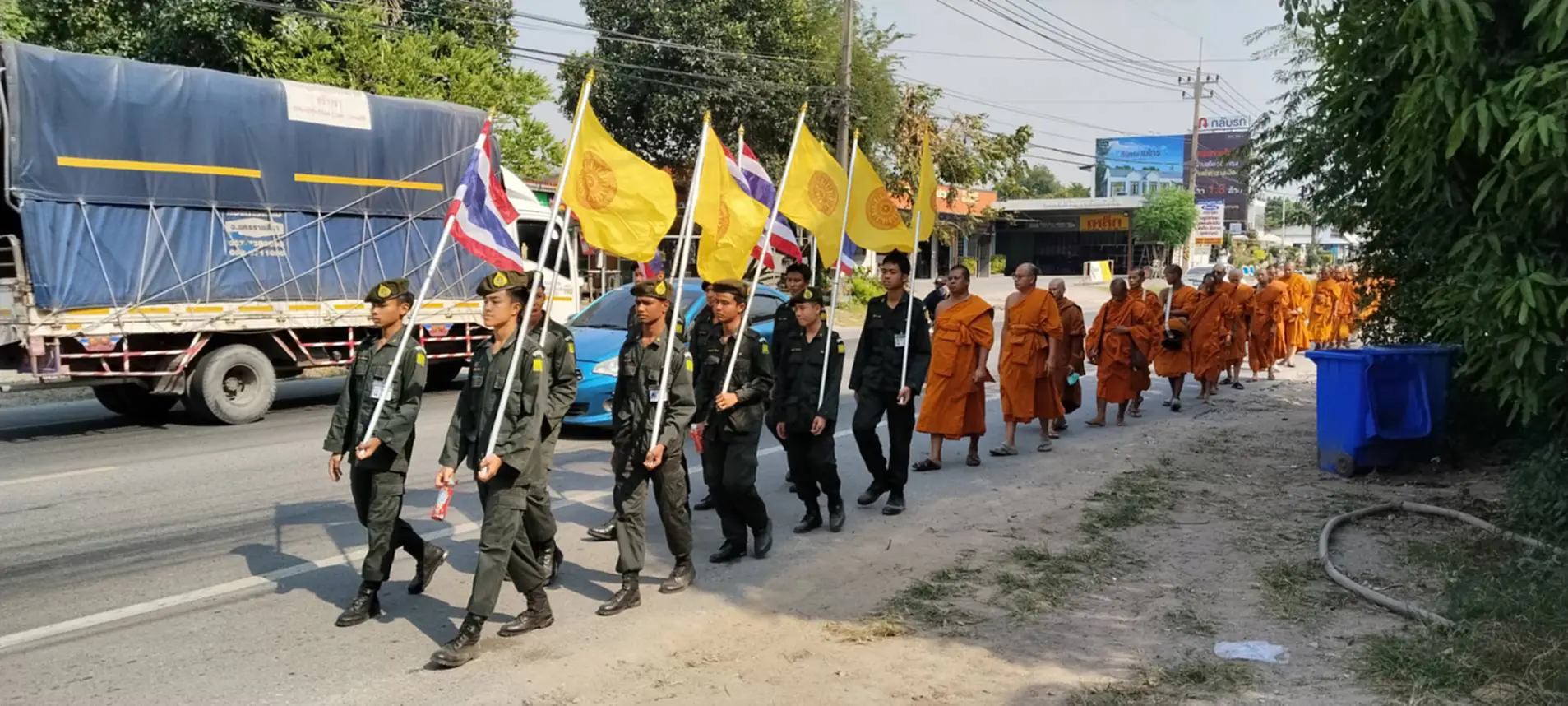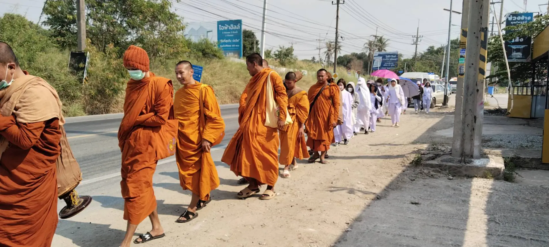 เมื่อเวลา13.30น.วันที่ 2 ธันวาคม ที่วัดเนินกระบก ตำบลบ่อวิน อำเภอศรีราชา จังหวัดชลบุรี พระครูสุนทรธรรมวินิจเจ้าคณะตำบลเขาคันทรงเขต1เจ้าอาวาสวัดระเวิงรังสรรค์ พระครูประภัสสรสุตคุณ เจ้าคณะตำบลแหลมฉบัง เจ้าอาวาสวัดเนินบุญญาราม พระครูปุณณสิริวรรณ. สุจิตฺโต (อ.แขก) เจ้าอาวาสวัดเนินกระบก เดินนำคณะพระสงฆ์-สามเณร 80 รูปพร้อมด้วยอุบาสก-อุบาสิการวม20คน และ นักเรียนร.ด.จากโรงเรียนบึงศรีราชาวิทยาคมถือธงชาติไทย-ธงธรรมจักร ร่วมเดินนำขบวน ออกเดินไปตามเส้นทางท่ามกลางแสงแดดที่ร้อนจัด จากวัดเนินกระบก ตำบลบ่อวิน อำเภอศรีราชา ไปตามเส้นทางสายบ้านเนินกระบก-ตลาดบึง ระยะทางประมาณ 6 กิโลเมตร ไปยังวัดบึงราชาวาสตำบลบึง อำเภอศรีราชา จังหวัดชลบุรี