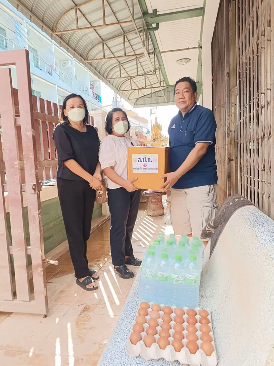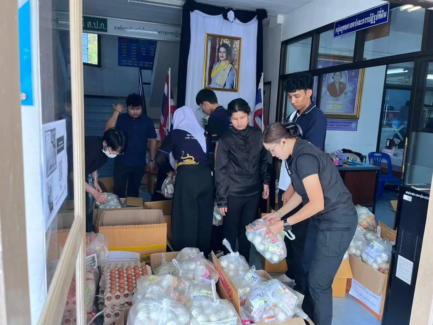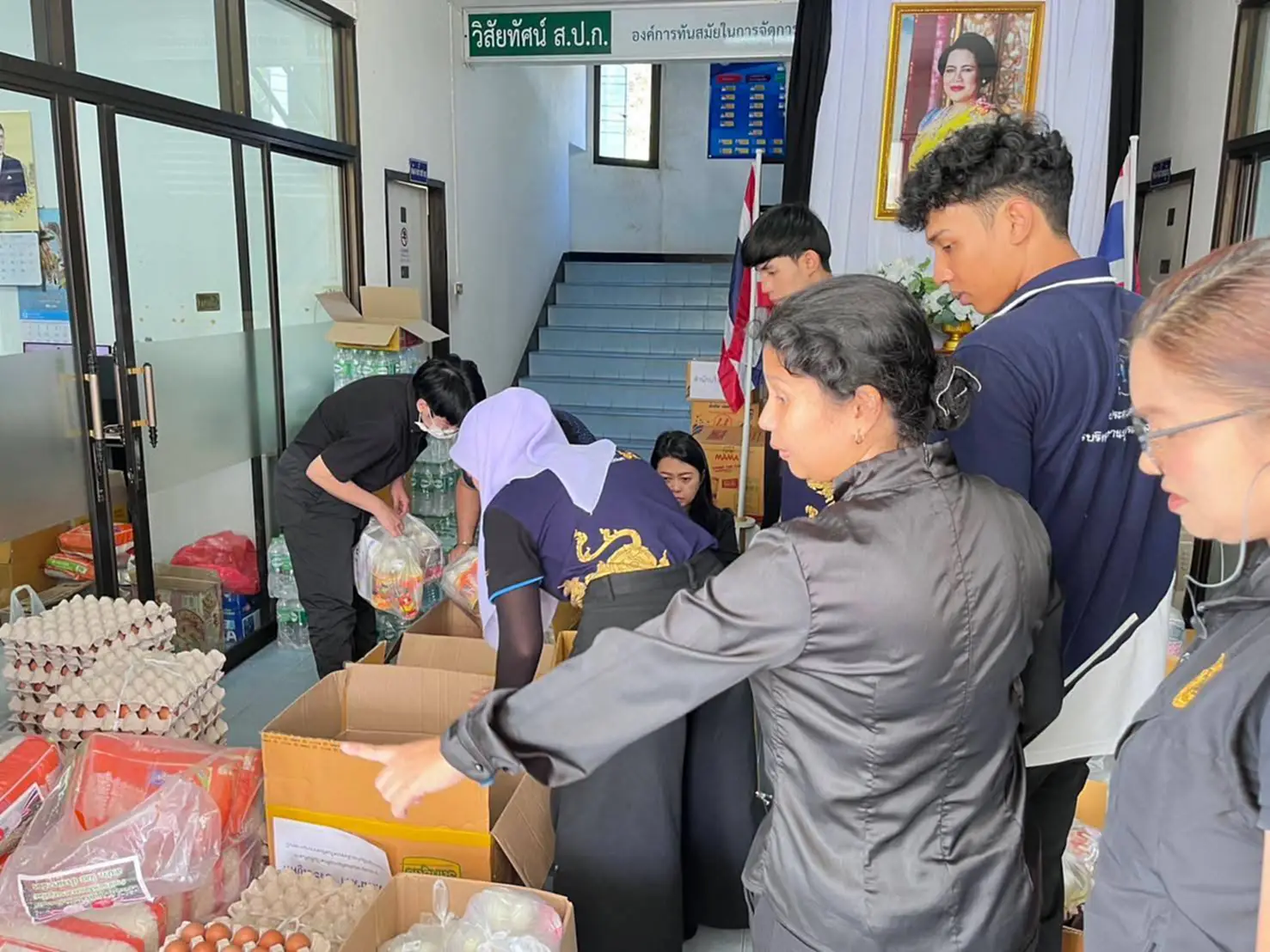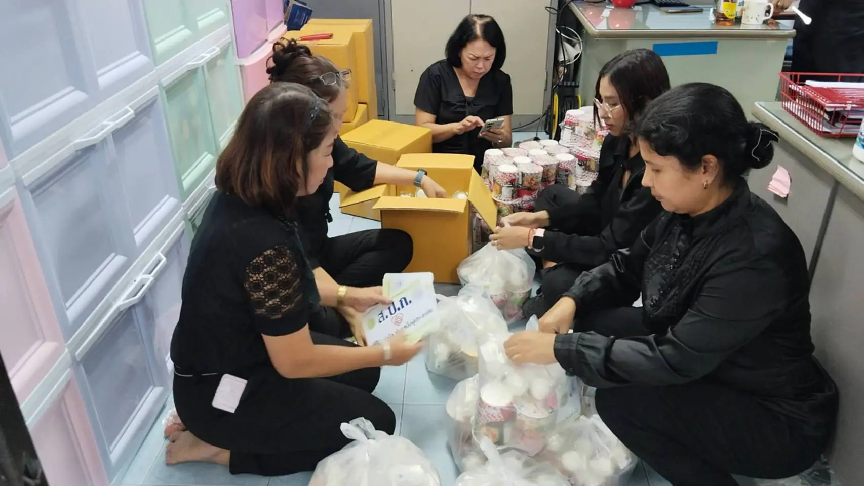 ประกอบด้วย ข้าวสาร น้ำดื่ม บะหมี่กึ่งสำเร็จรูป ไข่สด และไข่เค็ม ให้แก่บุคลากรของ ส.ป.ก. ที่ประสบภัยน้ำท่วม และมอบหมายเจ้าหน้าที่เร่งดำเนินการแพ็คถุงยังชีพ ประกอบด้วย ข้าวสาร น้ำดื่ม บะหมี่กึ่งสำเร็จรูป ไข่สด ไข่เค็ม ปลากระป๋อง ยาสีฟัน แปรงสีฟัน ผงซักฟอก สบู่ ผ้าอนามัย ฯลฯ
