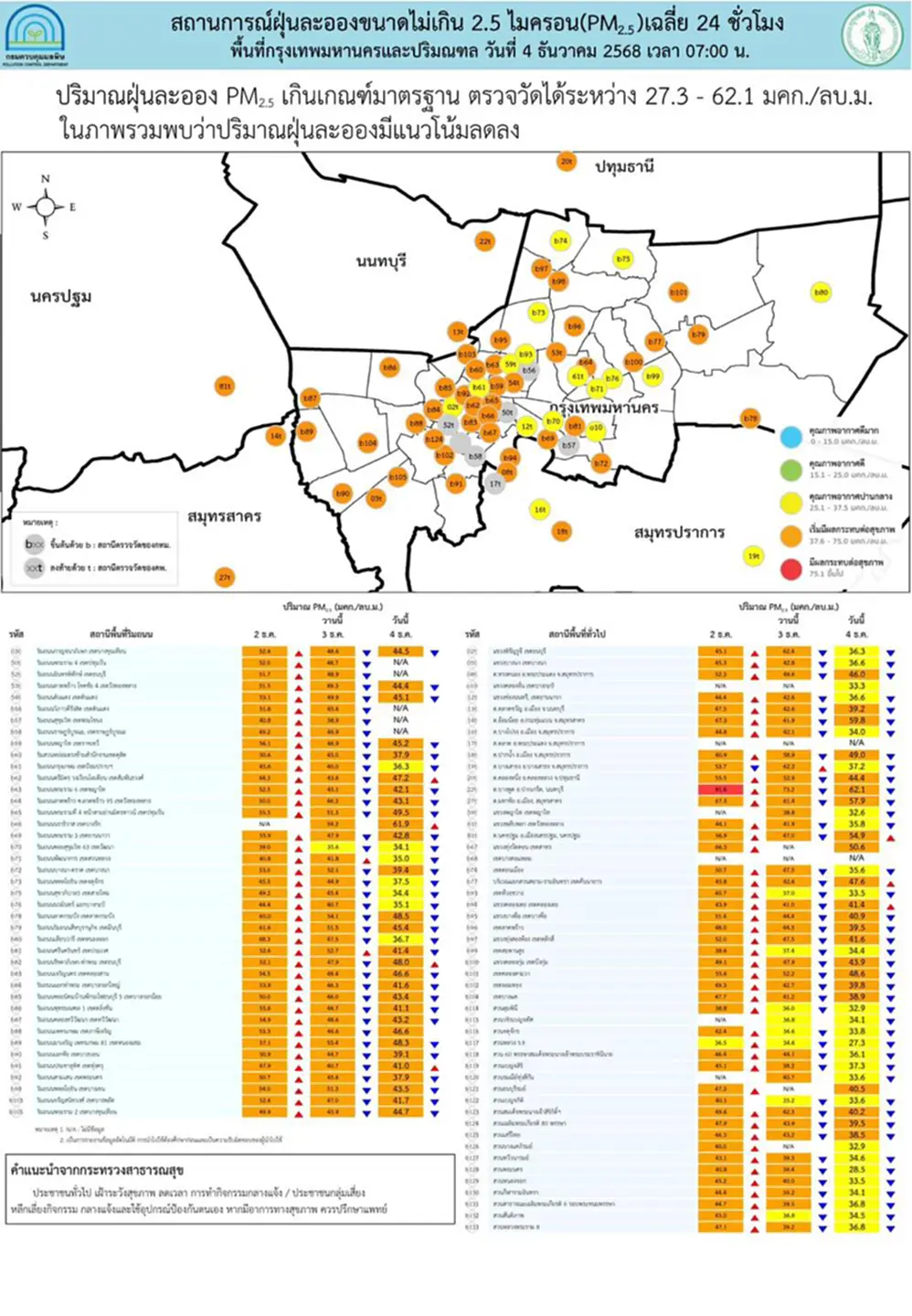 เมื่อวันที่ 4 ธันวาคม 2568 ศูนย์ข้อมูลคุณภาพอากาศกรุงเทพมหานคร ขอรายงานสถานการณ์ฝุ่นละอองขนาดไม่เกิน 2.5 ไมครอน (PM 2.5) ในกรุงเทพมหานคร ประจำวันที่ 4 ธันวาคม 2568 เวลา 07:00 น.