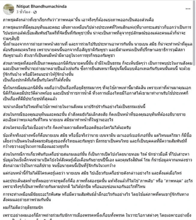 วันนี้ ( 4 ธ.ค.68 ) นายนิธิพัฒน์ พันธุ์ธุมจินดา อดีตนักศึกษาเกาหลี และผู้ประกอบการส่งออกปลาสวยงาม โพสต์ข้อความผ่านเฟซบุ๊กส่วนตัว Nitipat Bhandhumachinda ระบุว่า มีคำถามในโพสต์หนึ่งว่า ภาพชุดดังกล่าวที่เขาเรียกกันว่า “ภาพหลุด”นั้น เอาจริงๆ ก็ต้องแบ่งภาพออกเป็นสองส่วนคือ ภาพชุดแรกที่มีคุณอนุทินและคณะ เดินทางเหมือนไปต่างประเทศที่ไหนสักแห่ง ที่บางกระแสข่าวก็บอกว่าเป็นการไปแข่งกอล์ฟเชื่อมสัมพันธ์ไมตรีที่จัดขึ้นที่กัมพูชานั้น น่าจะเป็นภาพที่ดูจากรูปลักษณ์ของแต่ละคนแล้วก็น่าจะร่วมๆสิบปี