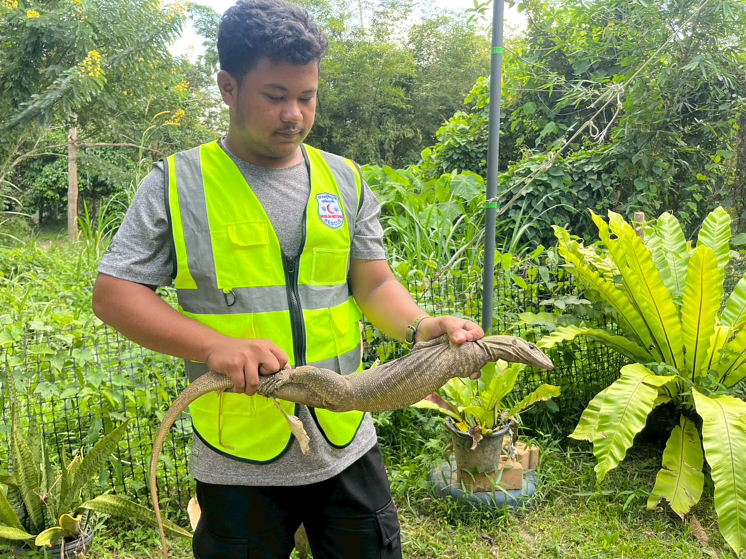 โดยชาวบ้าน เล่าว่า ขณะที่เปิดประตูหลังบ้าน ได้เห็นสัตว์เลื้อยคลาน ตกใจวิ่งหาทางออกอย่างอลหม่าน จึงได้ใช้คราดพลาสติก ไล่ให้ออกจากประหลังบ้าน แต่เจ้าตะกวดน่าจะตกใจกลับวิ่งหาทางออกจนหัวไปติดตาข่ายพลาสติก คาดว่าน่าจะมาจากคลองหลังบ้านเพื่อหาปลาเป็นอาหาร หรือออกมาหาแหล่งวางไข่ในฤดูฝน และเกรงจะเข้าไปในบ้าน จึงโทรแจ้งกู้ภัยเข้าช่วยจับปล่อยคืนสู่ธรรมชาติต่อไป สร้างความปลาบปลื้มใจ ให้กับชาวบ้านเป็นอย่างมาก ถึงความมีจิตอาสาของการเป็นหน่วยกู้ภัย ที่อุทิศตนเพื่อสังคมอย่างแท้จริง