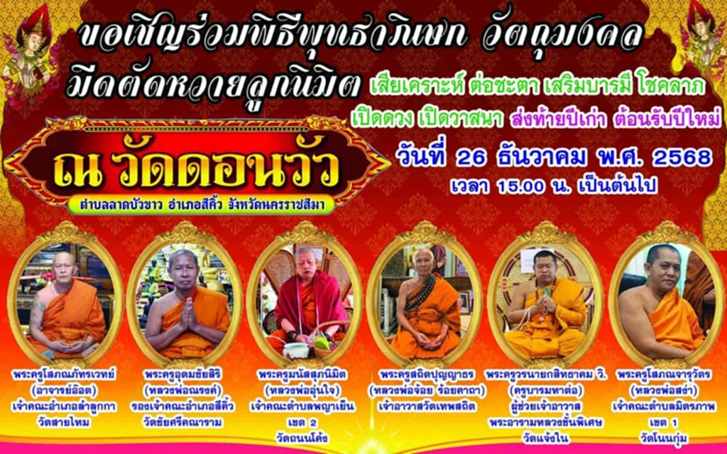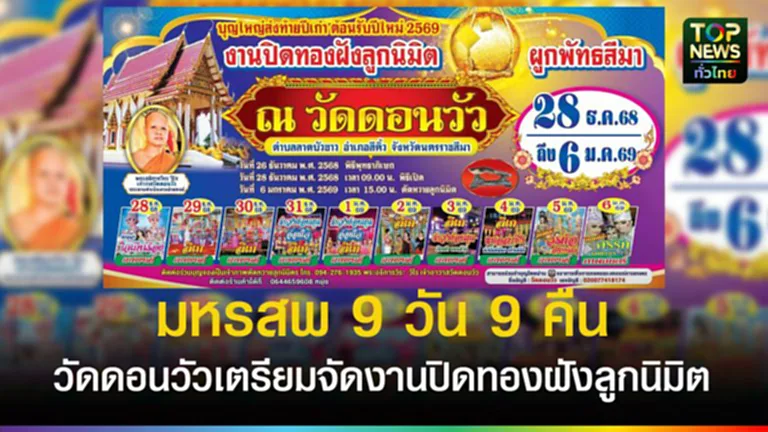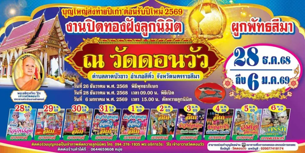 เมื่อวันที่ 4 ธันวาคม 2568 ที่ วัดดอนวัว ตำบลลาดบัวขาว อำเภอสีคิ้ว จังหวัดนครราชสีมา เตรียมจัดงานปิดทองฝังลูกนิมิตประจำปีอย่างยิ่งใหญ่ ระหว่างวันที่ 28 ธันวาคม 2568 ถึง 6 มกราคม 2569 เชิญชวนพุทธศาสนิกชนและประชาชนทั่วไปร่วมทำบุญเสริมสิริมงคล พร้อมชมมหรสพหลากหลายตลอดงาน