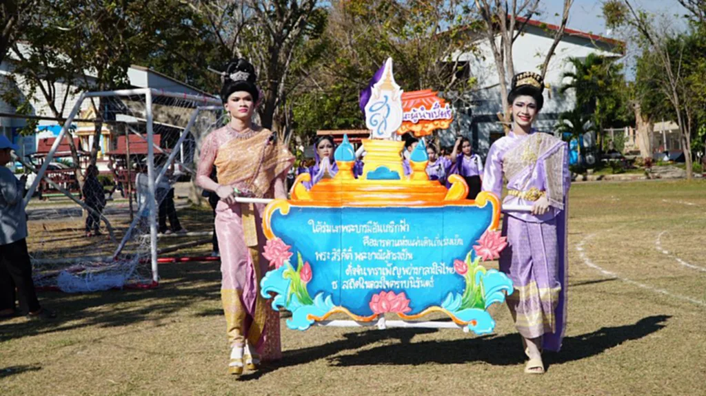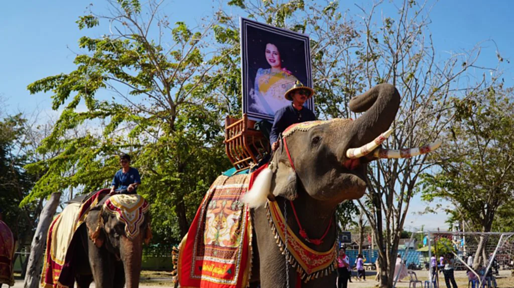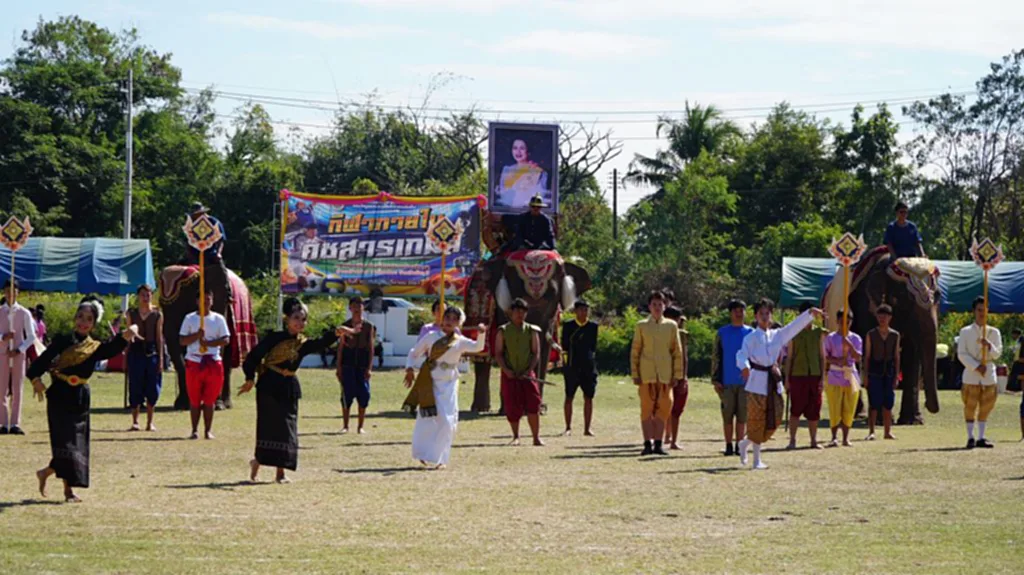 บรรยากาศพิธีเปิดเต็มไปด้วยสีสันและพลังงานอันสดใส การเดินขบวนพาเหรดของนักกีฬาเริ่มต้นอย่างสง่างาม ด้วยขบวนไว้อาลัยสมเด็จพระพันปีหลวง ฯ จากนั้นตามมาด้วยขบวนไฮไลต์จาก “น้องช้างแสนรู้” จากชุมชนช้างบ้านค่ายฯ ที่มาพร้อมกับขบวนนักเรียนที่แต่งกายด้วยชุดหลากสีสันสวยงามอย่างอลังการ