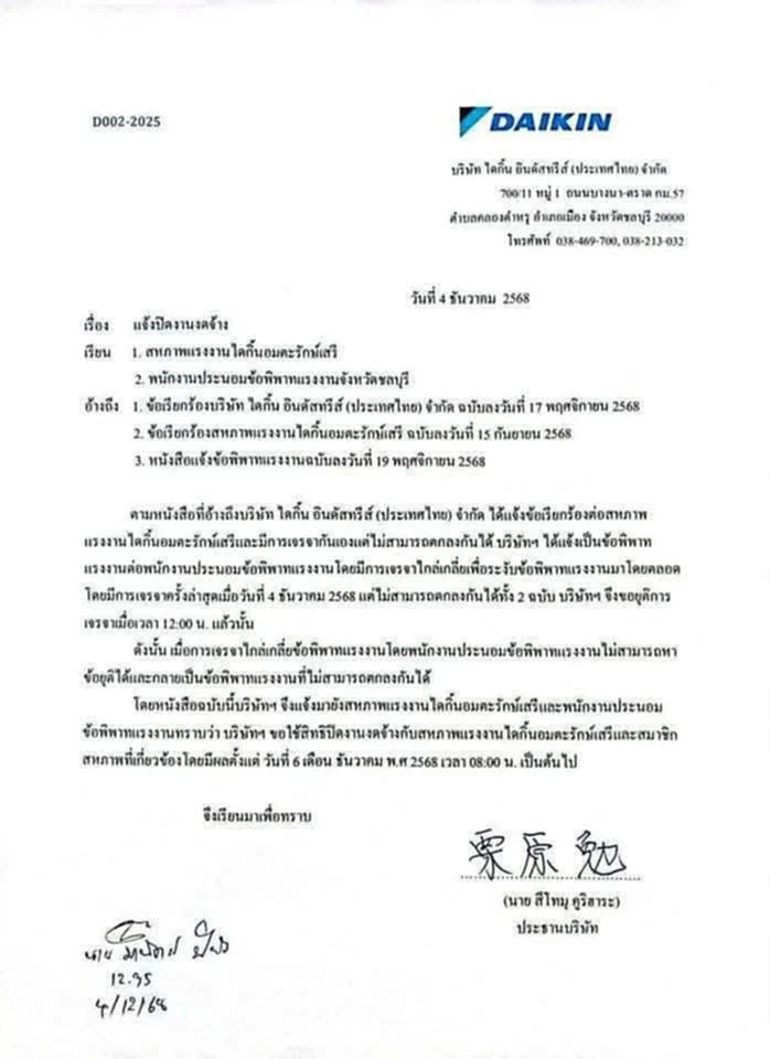 4 ธ.ค.2568 บริษัทไดกิ้น อินดัสทรีส์ (ประเทศไทย) จำกัด ออกหนังสือแจ้งการใช้สิทธิ “ปิดงานงดจ้าง” ต่อสหภาพแรงงานไดกิ้นอมตะรักษ์เสรีและสมาชิกสหภาพฯ โดยจะมีผลบังคับใช้ตั้งแต่วันที่ 6 ธันวาคม พ.ศ. 2568 เวลา 08.00 น. เป็นต้นไป