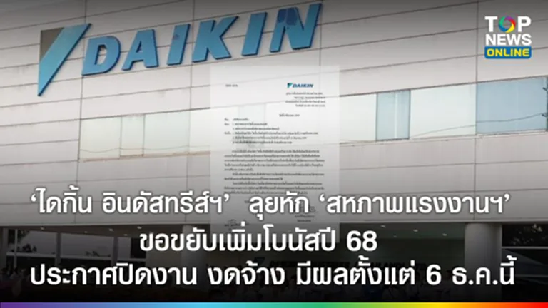 “ไดกิ้น อินดัสทรีส์ฯ” ลุยหัก “สหภาพแรงงานฯ” ขอขยับเพิ่มโบนัสปี 68 ประกาศปิดงาน งดจ้าง มีผลตั้งแต่ 6 ธ.ค.นี้