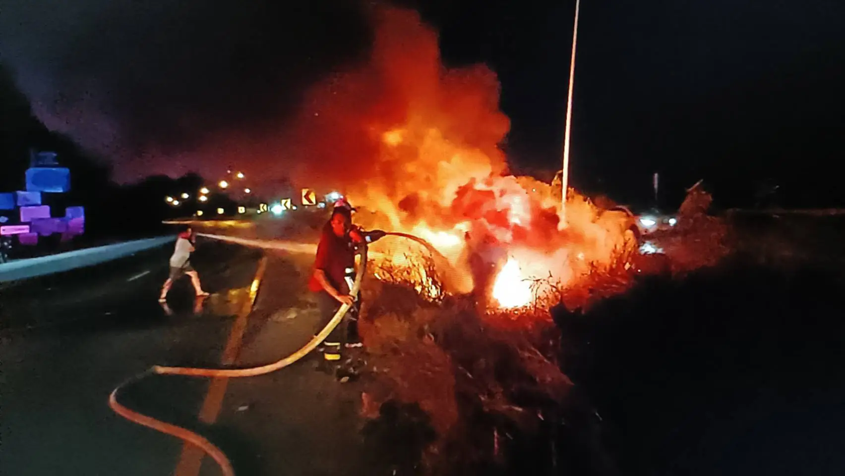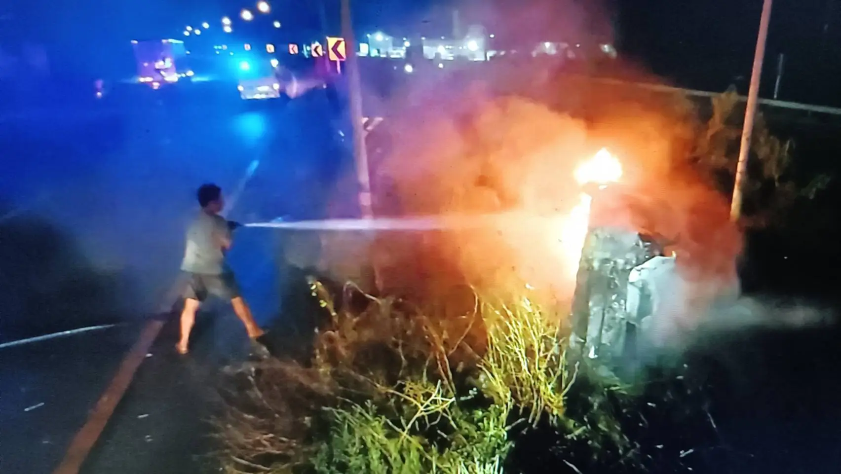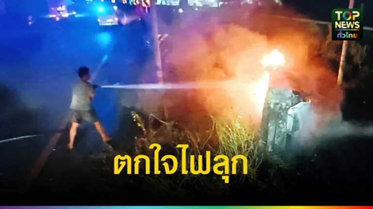 ก่อนพุ่งชนเสาไฟส่องแสงสว่างริมทาง รถพลิกคว่ำ และเกิดไฟลุกไหม้อย่างรวดเร็ว โดยมีรถน้ำ จำนวน 2 คันได้พยายามเข้าควบคุมไฟที่กำลังลุกไหม้อยู่ แต่ก็ไม่สามารถควบคุมเอาไว้ได้ ทำให้รถได้รับความเสียหายทั้งคัน