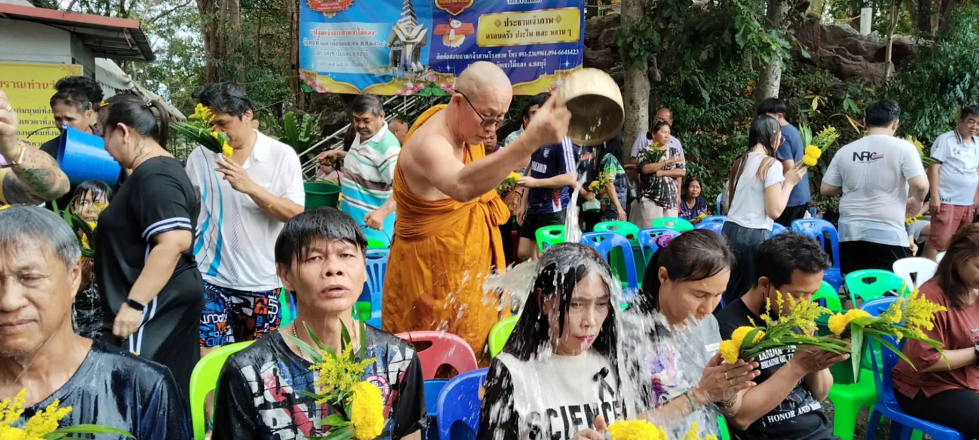 หลวงพ่อสง่าได้นั่งบริกรรมคาถาอยู่หน้าขันน้ำมนต์และโอ่งขนาดใหญ่ 2 โอ่ง และอ่างอาบน้ำอีก 2 อ่าง ก่อนทำพิธีอาบน้ำมนต์ให้ผู้ร่วมงานคนละ 1 ขัน จากนั้นให้ลูกศิษย์ช่วยเทน้ำมนต์ราดร่างต่อเนื่องจนทั่วถึงทุกคน ใช้เวลาประมาณกว่า2ชั่วโมงจึงเสร็จสิ้น ท่ามกลางแสงแดดที่ร้อนระอุ แต่ศรัทธาของพุทธศาสนิกชนยังคงไม่ลดน้อยลงแต่อย่างไร