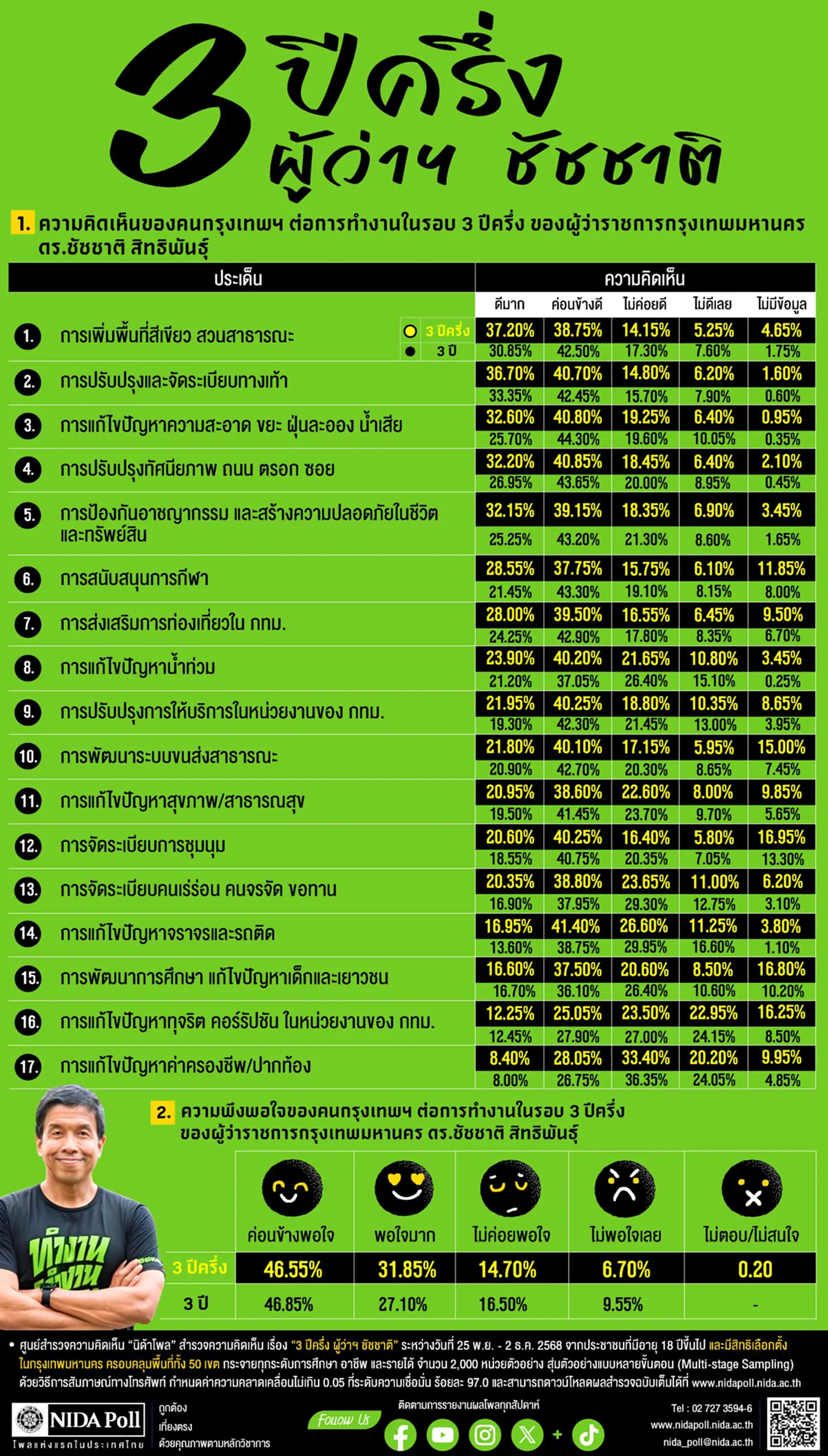 เมื่อวันที่ 7 ธันวาคม 2568 ศูนย์สำรวจความคิดเห็น “นิด้าโพล” สถาบันบัณฑิตพัฒนบริหารศาสตร์ (นิด้า) เปิดเผยผลการสำรวจ เรื่อง “3 ปีครึ่ง ผู้ว่าฯ ชัชชาติ” ทำการสำรวจระหว่างวันที่ 25 พฤศจิกายน – 2 ธันวาคม 2568 จากประชาชนที่มีอายุ 18 ปีขึ้นไป และมีสิทธิเลือกตั้งในกรุงเทพมหานคร ครอบคลุมพื้นที่ทั้ง 50 เขต กระจายทุกระดับการศึกษา อาชีพ และรายได้ รวมจำนวนทั้งสิ้น 2,000 หน่วยตัวอย่าง เกี่ยวกับการทำงานในรอบ 3 ปีครึ่ง ของผู้ว่าราชการกรุงเทพมหานคร นายชัชชาติ สิทธิพันธุ์ การสำรวจอาศัยการสุ่มตัวอย่างโดยใช้ความน่าจะเป็นจากบัญชีรายชื่อฐานข้อมูลตัวอย่างหลัก (Master Sample) ของ “นิด้าโพล” สุ่มตัวอย่างแบบหลายขั้นตอน (Multi-stage Sampling) เก็บข้อมูลด้วยวิธีการสัมภาษณ์ทางโทรศัพท์ โดยกำหนดค่าความคลาดเคลื่อนไม่เกิน 0.05 ที่ระดับความเชื่อมั่น ร้อยละ 97.0