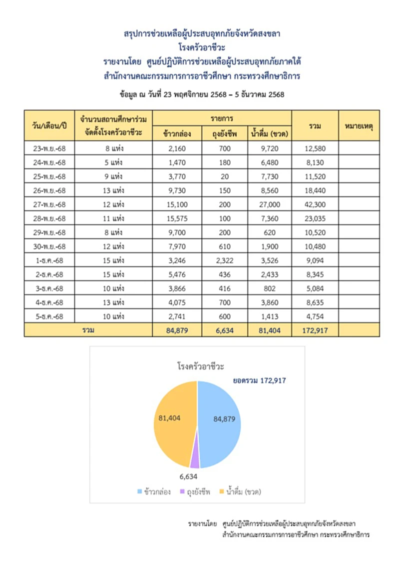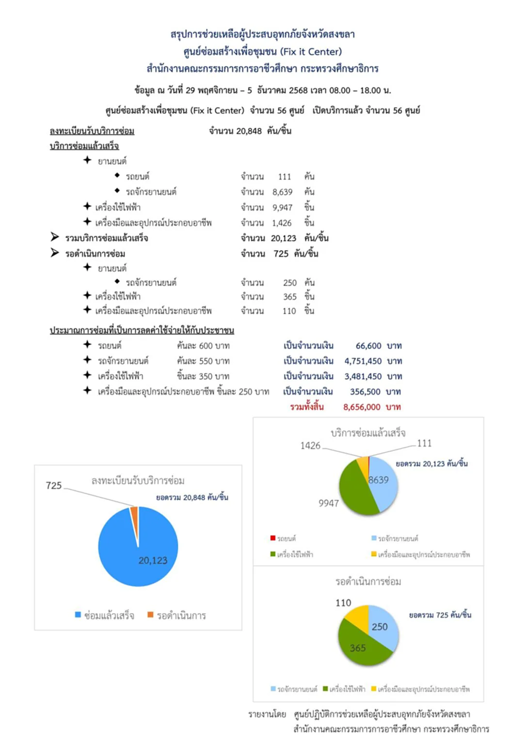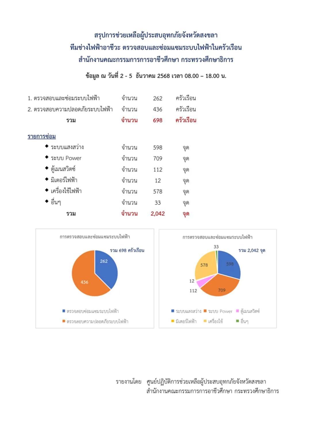 ตามข้อสั่งการเร่งด่วนของ ร.อ.ธรรมนัส พรหมเผ่า รองนายกรัฐมนตรี และ ศ.ดร.นฤมล ภิญโญสินวัฒน์ รัฐมนตรีว่าการกระทรวงศึกษาธิการ (รมว.ศธ.) ที่มอบหมายให้สถานศึกษาในสังกัดเร่งเข้าช่วยเหลือประชาชนในพื้นที่น้ำท่วมจังหวัดสงขลาอย่างทันที สำนักงานคณะกรรมการการอาชีวศึกษา (สอศ.) ได้ระดม “พลังอาชีวะทั่วประเทศ” จากวิทยาลัยเทคนิค–อาชีวะทุกภูมิภาค ส่งครูและนักศึกษาเข้าปฏิบัติภารกิจช่วยเหลืออย่างครบวงจร ทั้งด้านช่างไฟฟ้า ศูนย์ Fix It Center และโรงครัวอาชีวะ เพื่อฟื้นฟูคุณภาพชีวิตประชาชนอย่างเร่งด่วนและปลอดภัยที่สุด