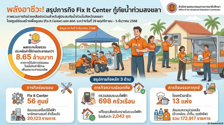 นายยศพล เวณุโกเศศ เลขาธิการคณะกรรมการการอาชีวศึกษา เปิดเผยว่า จากการระดมกำลังปฏิบัติงานระหว่างวันที่ 29 พฤศจิกายน – 5 ธันวาคม 2568 สอศ.เปิดให้บริการศูนย์ Fix It Center จำนวน 56 ศูนย์ ให้บริการซ่อมยานพาหนะ–เครื่องใช้ไฟฟ้ารวม 20,848 รายการ และซ่อมสำเร็จแล้ว 20,123 รายการ คิดเป็นมูลค่าการประหยัดค่าใช้จ่ายรวมกว่า 8,656,000 บาท ขณะเดียวกัน “ทีมช่างไฟฟ้าอาชีวะ” ได้ลงพื้นที่ตรวจสอบและซ่อมระบบไฟฟ้าให้ประชาชนจำนวน 698 ครัวเรือน ครอบคลุมจุดซ่อมกว่า 2,042 จุด ส่วนด้านการดูแลปัจจัยสี่ สอศ.ได้ตั้งโรงครัวอาชีวะจำนวน 13 แห่ง ผลิตข้าวกล่อง 84,879 กล่อง แจกถุงยังชีพ 6,634 ชุด และน้ำดื่ม 81,404 ขวด รวมการช่วยเหลือด้านอาหารกว่า 172,917 รายการ ซึ่งสะท้อนผลการปฏิบัติงานที่เป็นรูปธรรมและเข้าถึงประชาชนในพื้นที่อย่างแท้จริง