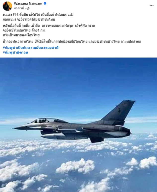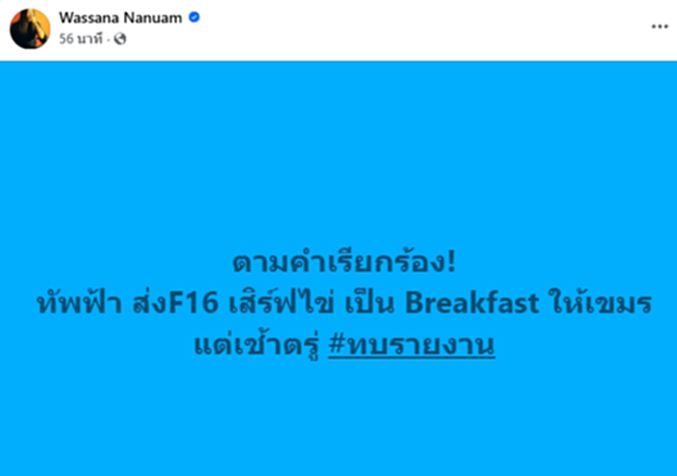 ล่าสุดวันนี้ (8 ธ.ค.) เพจเฟซบุ๊กของ “วาสนา นาน่วม” นักข่าวอาวุโสสายทหาร ได้โพสต์ข้อความ ระบุว่า ตามคำเรียกร้อง! ทัพฟ้า ส่งF16 เสิร์ฟไข่ เป็น Breakfast ให้เขมร