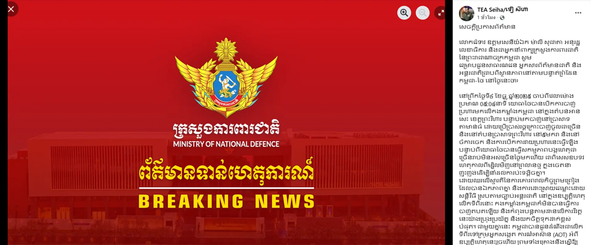 กระทรวงกลาโหมกัมพูชา ขอประณามอย่างรุนแรงต่อการกระทำที่ไร้มนุษยธรรมและโหดร้ายนี้ ซึ่งเห็นได้ชัดเจนว่า ฝ่ายไทยละเมิดแถลงการณ์ร่วมว่าด้วยข้อตกลงสันติภาพกัมพูชา-ไทย ที่ทั้งสองฝ่ายลงนามเมื่อวันที่ 26 ตุลาคม 2568 และขอเรียกร้องให้ประชาคมระหว่างประเทศประณามอย่างรุนแรงต่อการละเมิดข้อตกลง และการกระทำที่ผิดกฎหมายซ้ำแล้วซ้ำเล่าของไทย พร้อมเรียกร้องให้ไทยต้องรับผิดชอบอย่างเต็มที่ต่อการละเมิดอย่างโจ่งแจ้ง