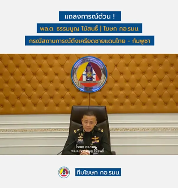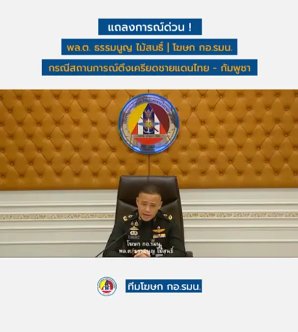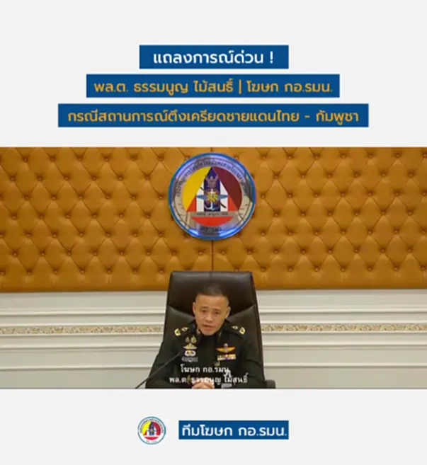เมื่อวันที่ 8 ธันวาคม 2568 พล.ต.ธรรมนูญ ไม้สนธิ์ โฆษกกองอำนวยการรักษาความมั่นคงภายในราชอาณาจักร (กอ.รมน.) ขอเรียนว่า ขณะนี้สถานการณ์ชายแดนไทย–กัมพูชายังคงมีความตึงเครียดเพิ่มขึ้น โดยบางจุดได้เกิดเหตุการใช้อาวุธระหว่างกำลังทหารฝ่ายไทยกับกำลังทหารฝ่ายกัมพูชา ซึ่งอาจส่งผลกระทบต่อความปลอดภัยของประชาชนในพื้นที่ใกล้เคียง จึงจำเป็นต้องเพิ่มมาตรการระมัดระวังและเฝ้าติดตามสถานการณ์อย่างใกล้ชิดเพื่อความปลอดภัยของประชาชนเป็นสำคัญ