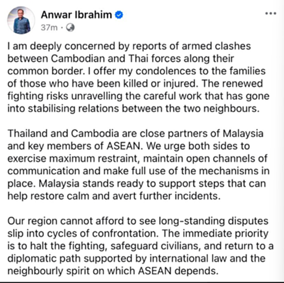 อันวาร์กล่าวว่ามาเลเซียพร้อมที่จะสนับสนุนขั้นตอนต่างๆ เพื่อฟื้นฟูความสงบและป้องกันไม่ให้เกิดเหตุการณ์การปะทะขึ้นอีก และย้ำว่าภูมิภาคอาเซียนไม่สามารถปล่อยให้เกิดข้อพิพาทที่ยืดเยื้อต่อไป และเน้นย้ำถึงความจำเป็นเร่งด่วนในการยุติการสู้รบ, ปกป้องพลเรือน และกลับสู่มาตรการทางทูตภายใต้กฎหมายระหว่างประเทศและจิตวิญญาณแห่งความเป็นเพื่อนบ้านของอาเซียน