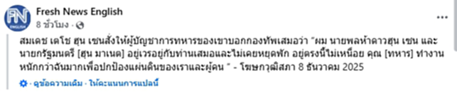 9 ธันวาคม 2568 เพจเฟซบุ๊กของ เฟรชนิวส์ สื่อกระบอกเสียงรัฐบาล โพสต์ภาพ ฮุน เซน ประธานวุฒิสภากัมพูชา หน้าตาอิดโรย มองหน้าจอโทรศัพท์ กับภาพขณะนั่งหัวโต๊ะประชุมกับทีมงาน รวมถึงนายเจีย ธีริธ โฆษกส่วนตัว / เฟรชนิวส์ ลงข้อความจากโฆษกฯ ว่า สมเด็จ ฮุน เซน สั่งผู้บัญชาการทหารให้บอกทหารอยู่เสมอว่า “ผม นาย 5 ดาว ฮุน เซนและนายกรัฐมนตรีฮุน มาเนต ปฏิบัติหน้าที่อยู่กับพวกท่านเสมอ ไม่เคยหยุดพัก ที่นี่ ผมไม่เหนื่อยเลย พวกท่าน (ทหาร) ทำงานหนักกว่าผมมากนัก เพื่อปกป้องแผ่นดินและประชาชนของเรา”