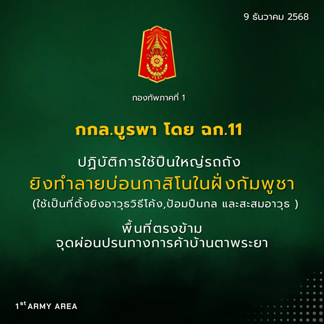 เมื่อวันที่ 9 ธันวาคม 2568 ศูนย์ปฏิบัติการกองทัพภาคที่ 1 ได้รับรายงานจาก กกล.บูรพา โดยหน่วยเฉพาะกิจที่ 11 ปฏิบัติการใช้ปืนใหญ่รถถัง ยิงทำลายบ่อนกาสิโนในฝั่งกัมพูชา ซึ่งอยู่ติดแนวชายแดน ใช้เป็นที่ตั้งยิงอาวุธวิธีโค้ง, ป้อมปืนกลและสะสมอาวุธ เพื่อใช้โจมใส่ฝ่ายไทย ในพื้นที่ตรงข้ามจุดผ่อนปรนทางการค้าบ้านตาพระยา อ.ตาพระยา จ.สระแก้ว