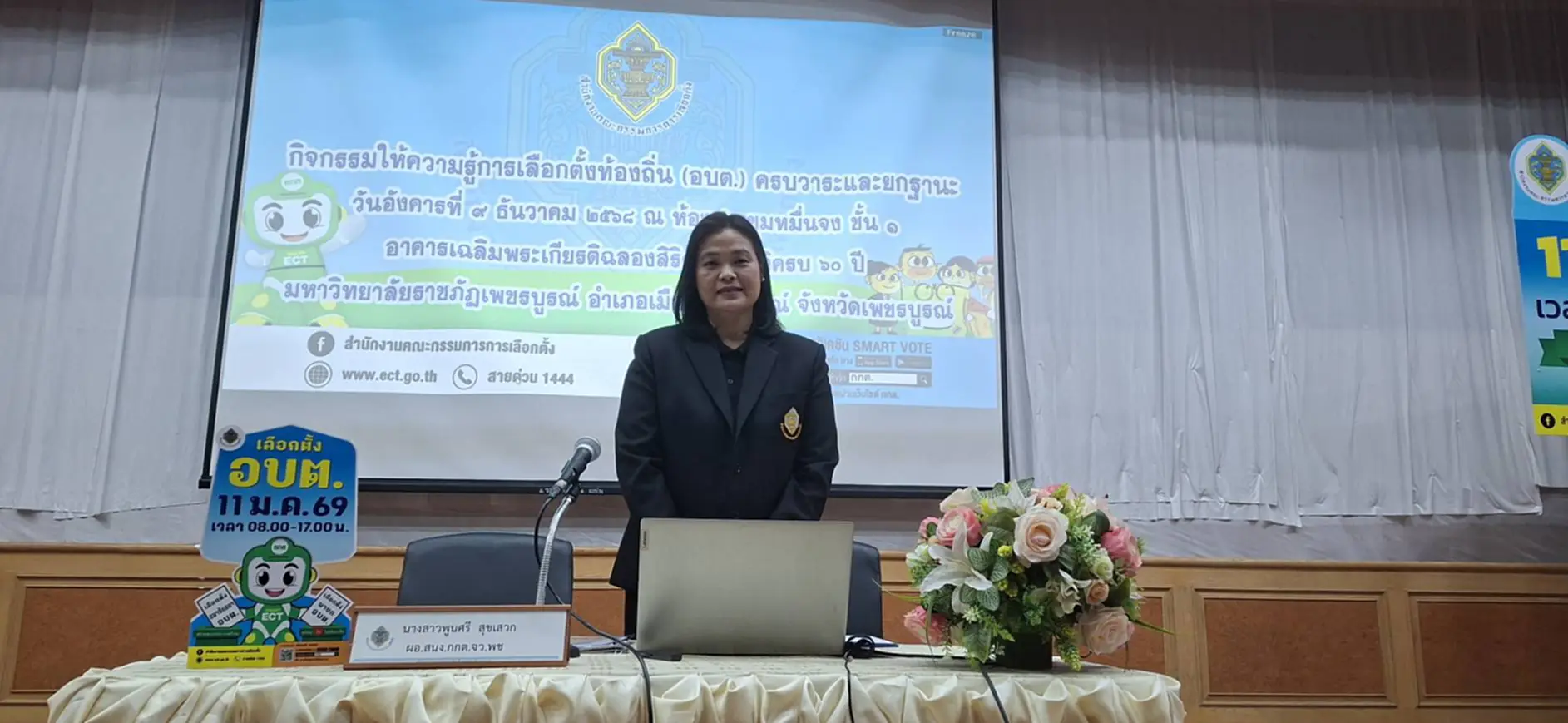 วันที่ 9 ธันวาคม 2568 ที่ห้องประชุมหมื่นจง ชั้น 1 อาคารเฉลิมพระเกียรติฉลองสิริราชสมบัติครบ 60 ปี มหาวิทยาลัยราชภัฏเพชรบูรณ์ อำเภอเมืองเพชรบูรณ์ จังหวัดเพชรบูรณ์ สำนักงานคณะกรรมการการเลือกตั้งประจำจังหวัดเพชรบูรณ์ จัดกิจกรรมอบรมให้ความรู้การเลือกตั้งท้องถิ่น (อบต.) กรณีครบวาระและการยกฐานะแก่ผู้สมัคร ผู้สนับสนุน และผู้มีส่วนเกี่ยวข้อง โดยมีนางสาวพูนศรี สุขเสวก ผู้อำนวยการสำนักงานคณะกรรมการการเลือกตั้งประจำจังหวัดเพชรบูรณ์ เป็นประธานในพิธีเปิด โดยมีนางจารุวรรณ กลีบกำไร รองผู้อำนวยการการเลือกตั้งประจำจังหวัดเพชรบูรณ์ กล่าวรายงาน มี คณะวิทยากร ข้าราชการ เจ้าหน้าที่และ ผู้สมัครรับเลือกตั้ง กกต.ท้องถิ่นจากองค์การบริหารส่วนตำบลกลุ่มเป้าหมายในรูปแบบออนไซด์ (On site) ประกอบด้วย อบต.สะเดียง อบต.ป่าเลา อบต.ดงมูลเหล็ก อบต.บ้านโคก อบต.ชอนไพร อบต.บ้านโตก และอบต.ท่าพล และOn-line ผ่านระบบZoom meeting มีองค์การบริหารส่วนตำบลเข้าร่วมกิจกรรมจำนวน 95 แห่ง รวมถึงคณะกรรมการการเลือกตั้งประจำองค์การบริหารส่วนตำบล ผู้สนับสนุน ผู้เกี่ยวข้อง และประชาชนผู้สนใจกว่า 430 คน เข้าร่วม