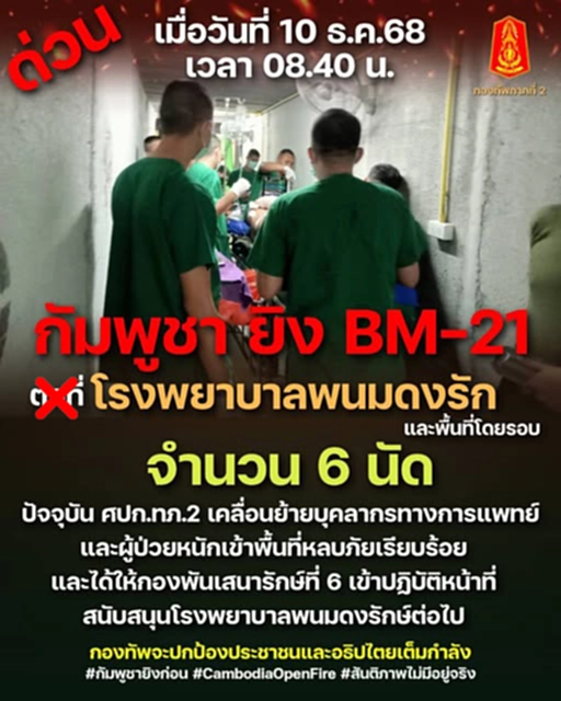 10 ธ.ค.2568 เพจเฟซบุ๊ก กองทัพภาคที่ 2 รายงานว่า เมื่อเวลา 08.40 น. “กัมพูชา ยิง BM-21 ตกที่โรงพยาบาลพนมดงรัก” และพื้นที่โดยรอบ จำนวน 6 นัด