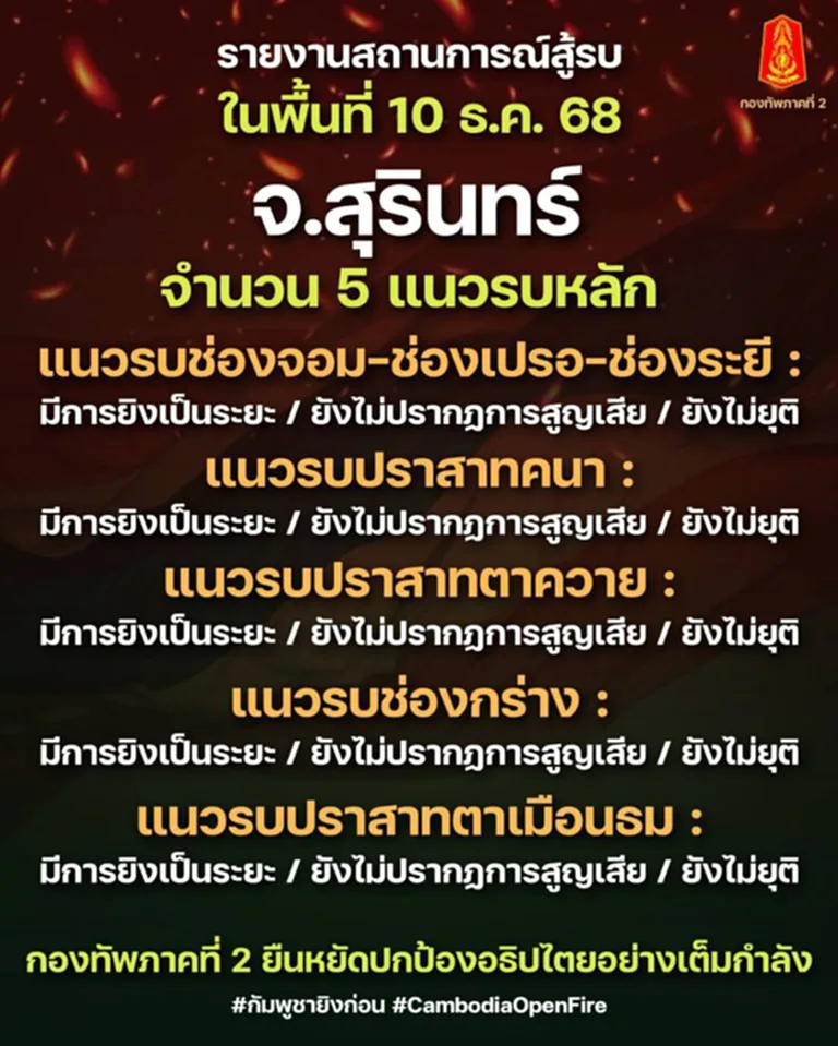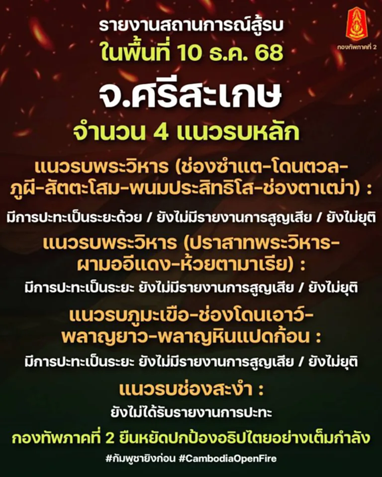 กองทัพภาคที่ 2 รายงานสถานการณ์สู้รบในพื้นที่ ในวันที่ 10 ธ.ค. 2568 ตั้งแต่เวลา 0520 น. ถึง0900 น. มีการปะทะ ในพื้นที่ ใน12 แนวรบ ที้ มีการปะทะเป็นระยะ แต่ ยังไม่ได้รับรายงานการสูญเสีย เช่น จ.บุรีรัมย์ 1 แนวรบหลัก : แนวรบช่องสายตะกู