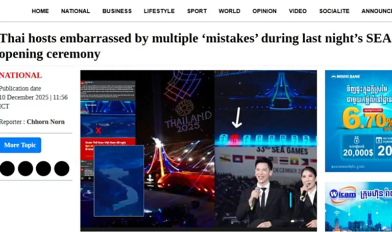 เดอะ พนมเปญโพสต์รายงานว่าพิธีเปิดการแข่งขันซีเกมส์คครั้งที่ 33 เมื่อคืนวันอังคารที่ 9 ธันวาคม 2568 ที่ผ่านมา ประเทศไทยซึ่งเป็นเจ้าภาพได้ประสบความอับอายขายหน้าอย่างมากบนเวทีระหว่างประเทศ เนื่องจากเกิดความผิดพลาดใหญ่ๆหลายจุด กระทบถึงหลายประเทศ รวมทั้งกัมพูชา, เวียดนาม, อินโดนีเซียและสิงคโปร์