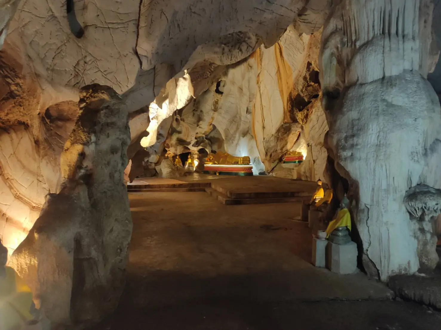 บริเวณด้านล่างมีลานประดิษฐานพระพุทธรูปปางไสยาสน์ ใช้ประกอบพิธีทางศาสนา รวมถึงพิธีสวดที่เกี่ยวข้องกับการนำน้ำทิพย์ไปใช้ในราชพิธีของสำนักพระราชวัง ทางวัดได้ติดตั้งไฟเพื่อให้ผู้มาเยือนชมความงดงามของถ้ำได้อย่างชัดเจนและปลอดภัย