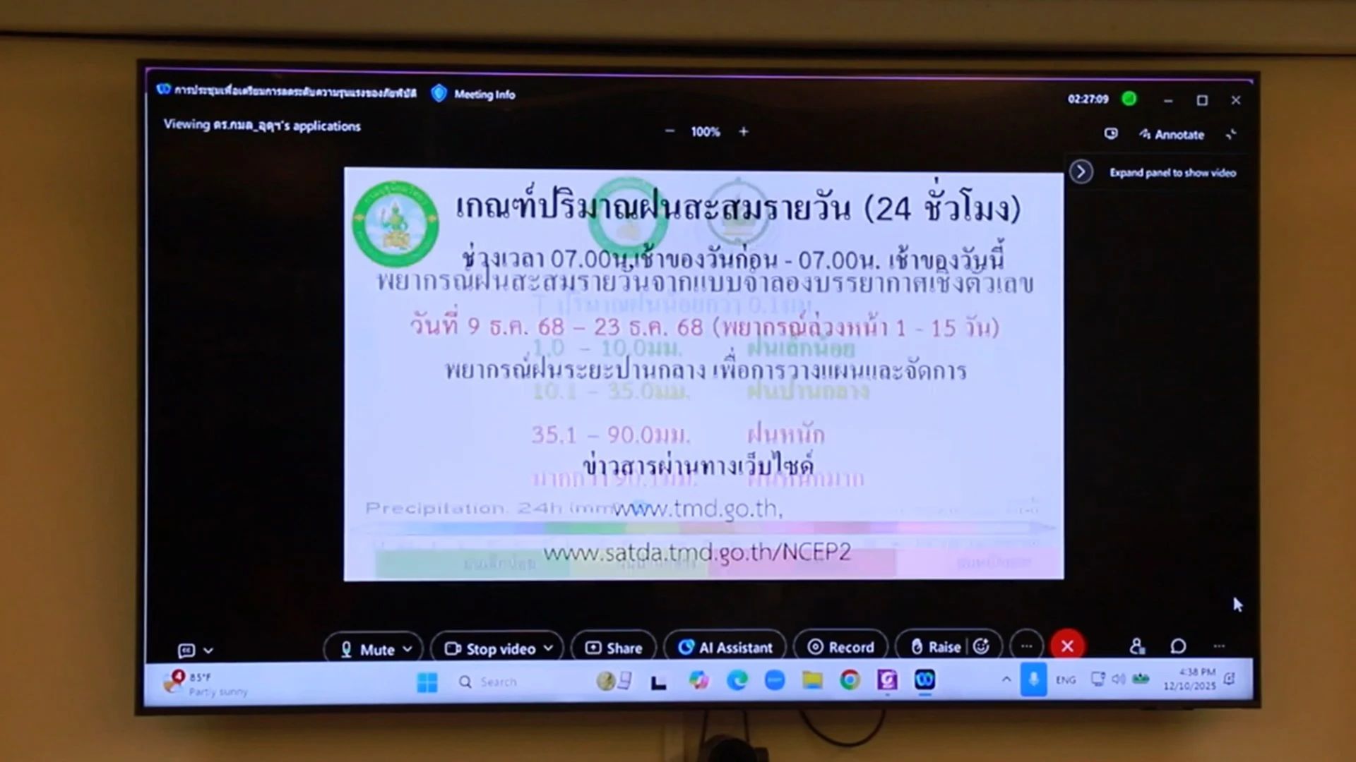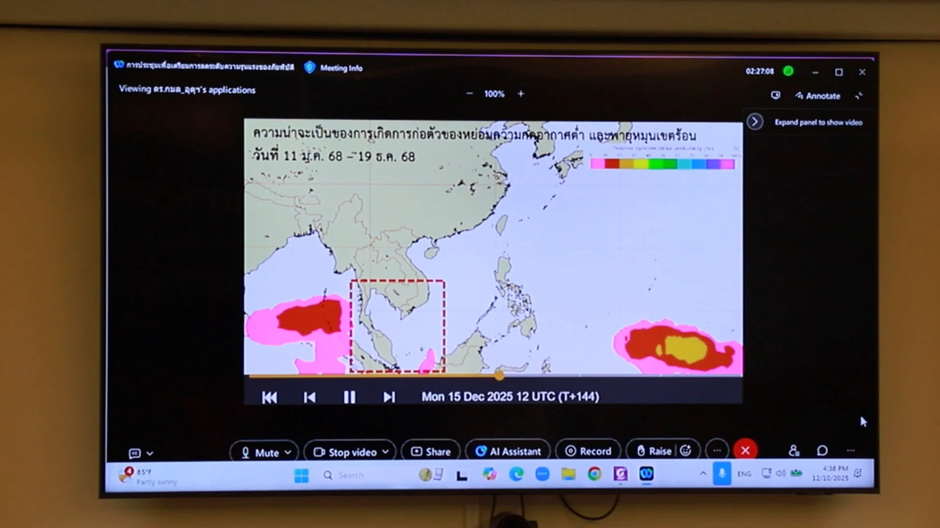 ในการประชุม ศูนย์อุตุนิยมวิทยารายงานคาดการณ์สภาพอากาศช่วงกลางเดือนธันวาคม โดยระบุว่าในวันที่ 11–12 ธันวาคม จะได้รับอิทธิพลจากหย่อมความกดอากาศต่ำกำลังแรง ส่งผลให้บางพื้นที่อาจมีฝนตกหนัก แต่จังหวัดสงขลาจะมีฝนอยู่ในระดับปานกลาง โดยเฉพาะบริเวณอำเภอระโนด ส่วนช่วงเฝ้าระวังสำคัญคือวันที่ 14–17 ธันวาคม ซึ่งอาจมีฝนเล็กน้อยถึงปานกลางในพื้นที่อำเภอเทพา สะบ้าย้อย นาทวี และหาดใหญ่ คาดการณ์ปริมาณฝนสะสมราว 50–60 มิลลิเมตร ซึ่งยังสามารถบริหารจัดการได้ ทั้งนี้ สถานการณ์มีแนวโน้มดีขึ้นหลังวันที่ 17–18 ธันวาคม โดยเฉพาะอำเภอหาดใหญ่ที่คาดว่าจะเข้าสู่เขตปลอดภัย