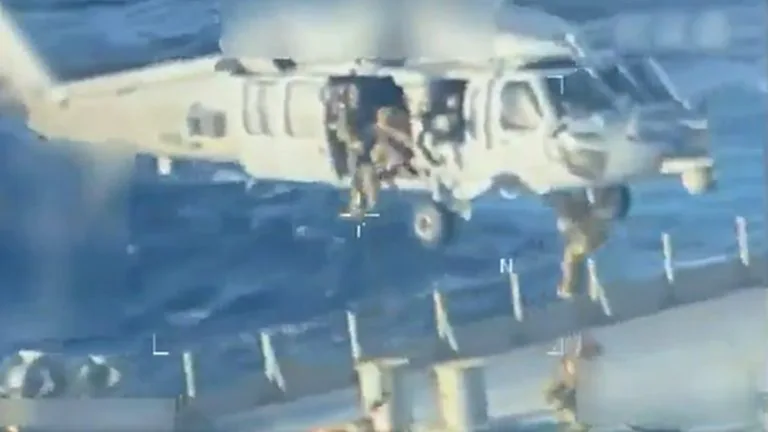 คลิปวิดีโอที่เผยแพร่โดย แพม บอนดี รัฐมนตรียุติธรรมสหรัฐฯ แสดงให้เห็นทหารสหรัฐฯ โรยตัวลงมาจากเฮลิคอปเตอร์ไปยังดาดฟ้าเรือบรรทุกน้ำมันขนาดใหญ่ลำหนึ่ง จากนั้น เข้าไปในเรือพร้อมกับยกปืนไรเฟิลขึ้น