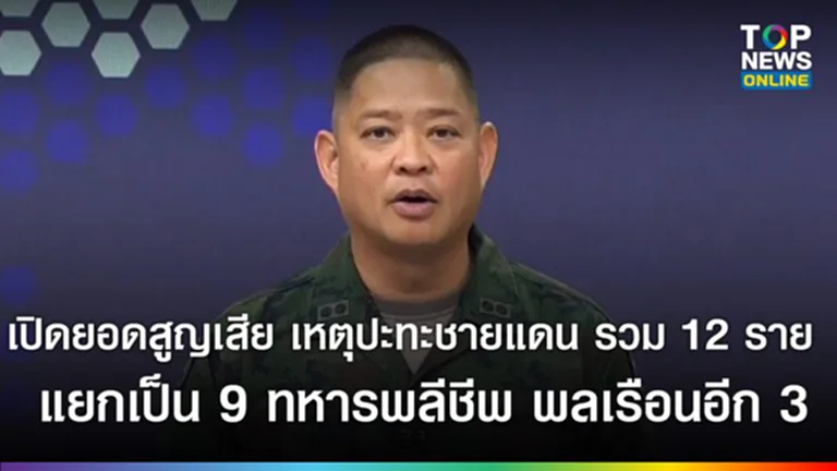 “โฆษกกลาโหม” แถลงยอดสูญเสียเหตุปะทะชายแดนแล้ว 12 ราย แยกเป็น 9 ทหารพลีชีพ พลเรือนอีก 3 ได้รับผลทางอ้อม บาดเจ็บรักษาตัว 120
