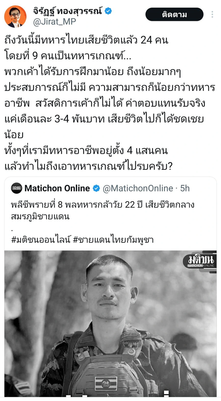 สืบเนื่องจากการที่ นายจิรัฏฐ์ ทองสุวรรณ์ ส.ส.ฉะเชิงเทรา พรรคประชาชน (ปชน.) ทวีตข้อความผ่าน X @Jirat_MP ว่า “ถึงวันนี้มีทหารไทยเสียชีวิตแล้ว 24 คน โดยที่ 9 คนเป็นทหารเกณฑ์… พวกเค้าได้รับการฝึกมาน้อย ถึงน้อยมากๆ ประสบการณ์ก็ไม่มี ความสามารถก็น้อยกว่าทหารอาชีพ สวัสดิการเค้าก็ไม่ได้ ค่าตอบแทนรับจริงแค่เดือนละ 3-4 พันบาท เสียชีวิตไปก็ได้ชดเชยน้อย ทั้งๆที่เรามีทหารอาชีพอยู่ตั้ง 4 แสนคน แล้วทำไมถึงเอาทหารเกณฑ์ไปรบครับ?