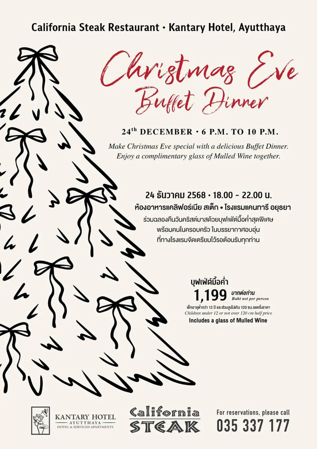 ในวันที่ 11 ธันวาคม 2568 นายอรุชา บัญชรนันทชัย ผู้จัดการทั่วไปโรงแรมแคนทารี อยุธยา เปิดเผยว่า ในช่วงเทศกาลวันคริสต์มาส ในวันที่ 24 ธันวาคม 2568 ช่วงเวลา 18.00 – 22.00 น. ทางโรงแรมแคนทารี อยุธยา ได้จัดบุฟเฟต์อาหารแบบนานาชาติมื้อค่ำสุดพิเศษ “Christmas Eve Buffet Dinner ” ที่เราจัดสรรมาอย่างพิถีพิถัน พร้อม Mulled Wine 1 แก้ว ของหวานแสนอร่อย และอีกมากมายที่พร้อมสร้างความประทับใจในทุกคำ ให้กับนักท่องเที่ยวทั้งชาวไทยและต่างชาติ ที่มาพักที่โรงแรม รวมถึงคนในจังหวัดพระนครศรีอยุธยา และใกล้เคียง พาครอบครัว และคนที่รัก มาร่วมสัมผัสดื่มด่ำกับบรรยากาศแสนอบอุ่นในค่ำคืนคริสต์มาสอีฟ ณ ห้องอาหาร แคลิฟอร์เนีย สเต็ก โรงแรมแคนทารี อยุธยา