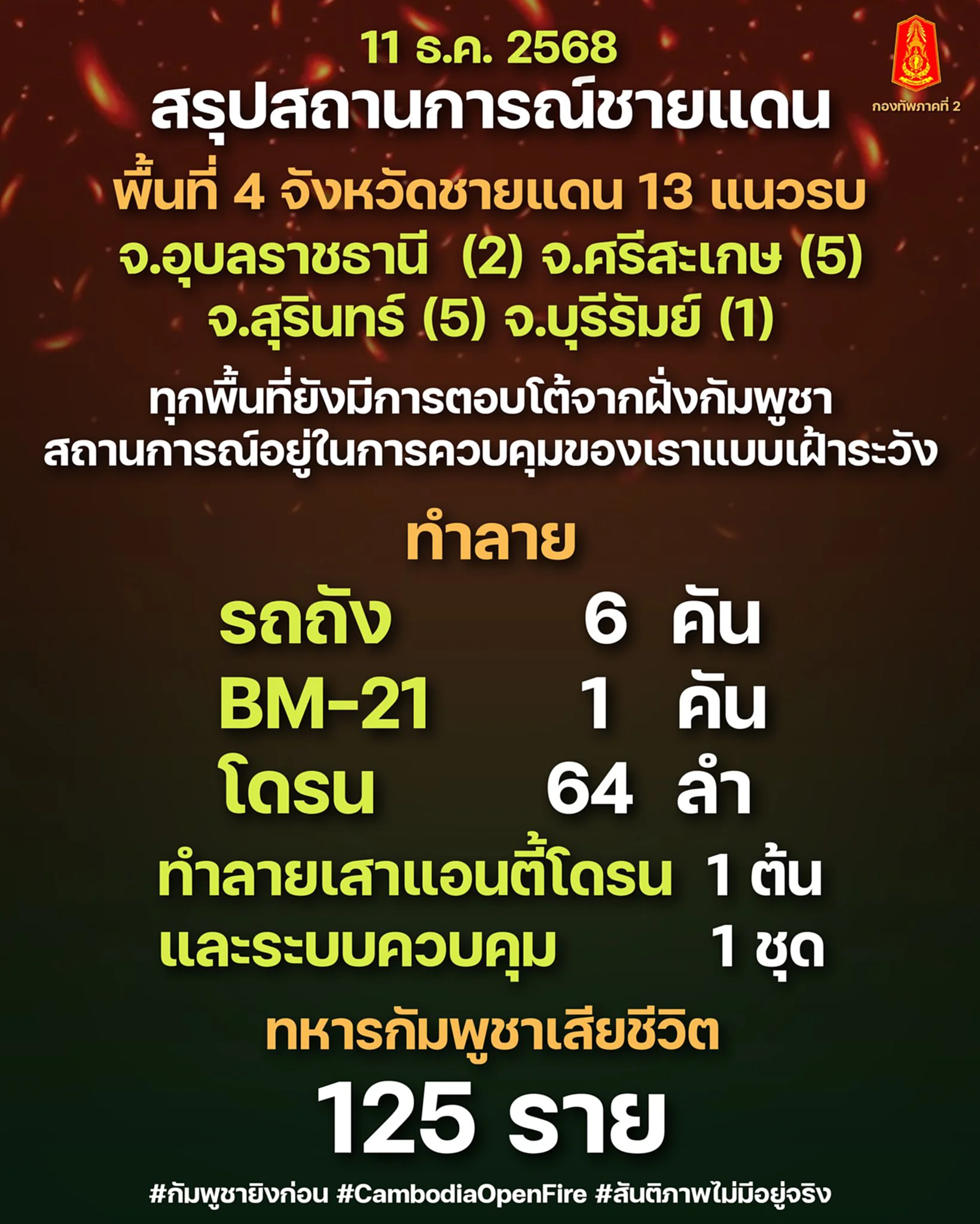 เมื่อวันที่ 11 ธันวาคม 2568 เวลา 17.16 น. ศูนย์ปฏิบัติการกองทัพภาคที่ 2 สรุปสถานการณ์ตามแนวชายแดนไทย-กัมพูชา ประจำวันที่ 11 ธันวาคม เวลา 17.00 น.ว่า ตามที่เมื่อวันที่ 7 ธันวาคม 2568 กัมพูชาได้ทำการยิงใส่ชุดลาดตระเวนของทหารไทยในพื้นที่ภูผาเหล็ก อำเภอกันทรลักษ์ จังหวัดศรีสะเกษ เป็นเหตุให้ทหารไทยได้รับบาดเจ็บ 2 นาย และได้เริ่มเปิดฉากการยิงด้วยปืนใหญ่และจรวดหลายลำกล้อง หรือ BM-21 เข้ามายังพื้นที่ดินแดนไทยตลอดแนวชายแดน ได้แก่ จังหวัดอุบลราชธานี ศรีสะเกษ สุรินทร์ และบุรีรัมย์ ทำให้บ้านเรือนของประชาชน พื้นที่การเกษตร และสถานพยาบาลในพื้นที่ได้รับความเสียหายอย่างมาก