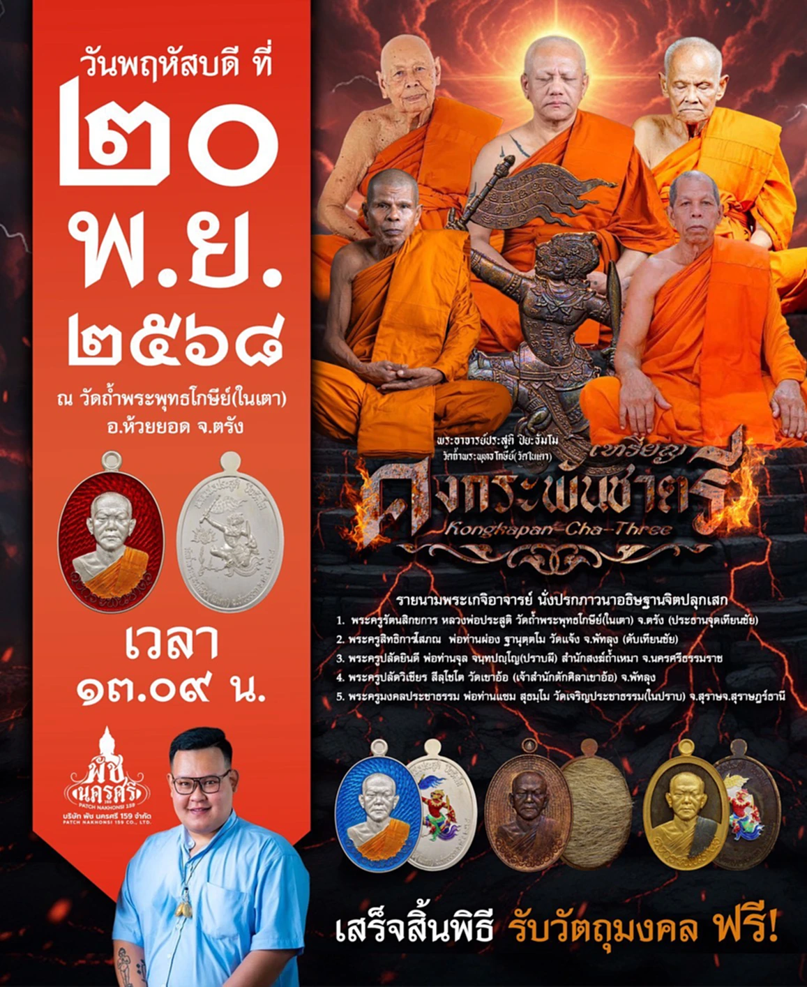ในการปลุกเสกครั้งนี้ พระอาจารย์ประสูติยังได้มอบยันต์พระยาชิงชัย ที่เก็บรักษามานานกว่า 30 ปี ให้ “พัช นครศรี” นำมาจัดสร้างวัตถุมงคลเป็นครั้งแรก โดยยันต์ดังกล่าวได้รับการสืบทอดวิชามาจาก พระครูลาย คงฺคสุวณฺโณ วัดหาดสูง พระอุปัชฌาย์ของพ่อท่านคล้าย จนฺทสุวณฺโณ ทั้งนี้ วัตถุมงคลได้ผ่านพิธีพุทธาภิเษกเมื่อวันที่ 20 พ.ย. 2568 ณ วัดถ้ำพุทธะโกษี (วัดในเตา) อ.ห้วยยอด จ.ตรัง ผู้สนใจสามารถติดต่อสอบถามข้อมูลหรือเช่าวัตถุมงคลรุ่นดังกล่าวได้ที่ หมายเลขโทรศัพท์ 098-745-2744