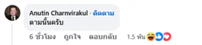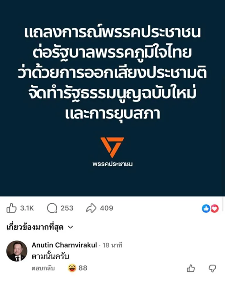โดยนายอนุทิน ชาญวีรกูล นายกรัฐมนตรีและรัฐมนตรีว่าการกระทรวงมหาดไทย ได้ไปคอมเมนต์ถึงเพจพรรคประชาชนว่า “ตามนั้นครับ”